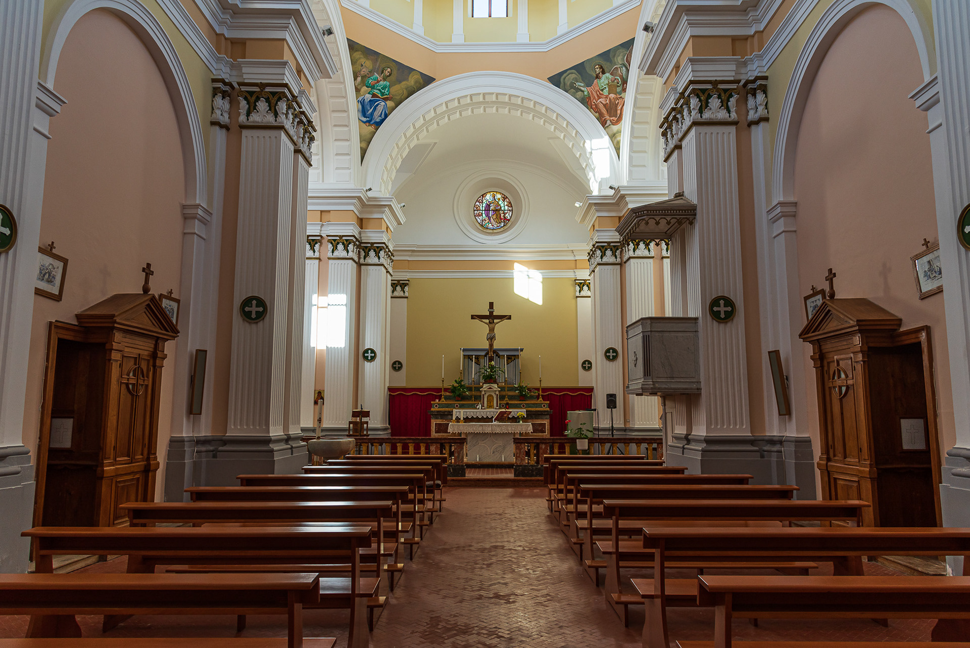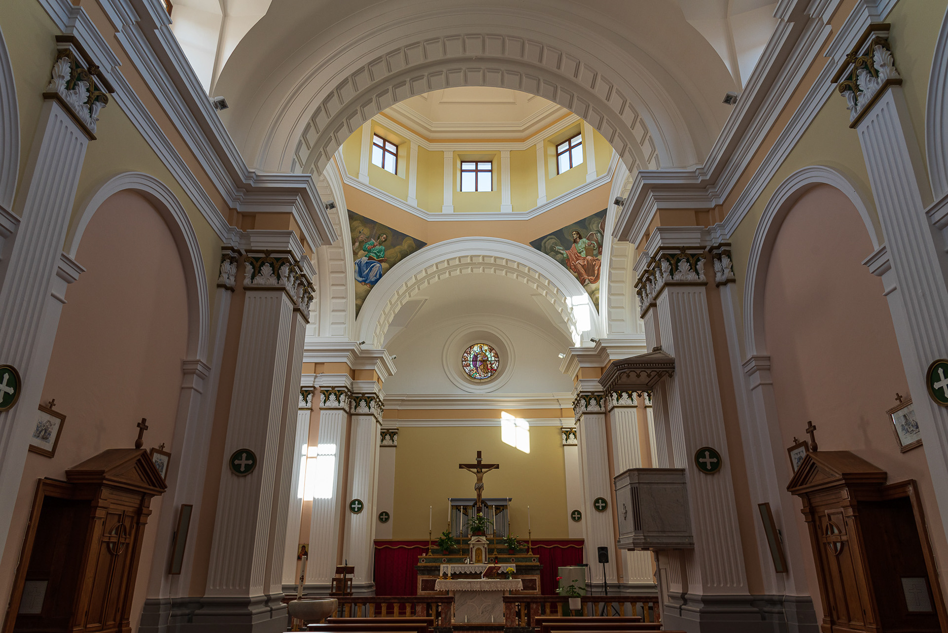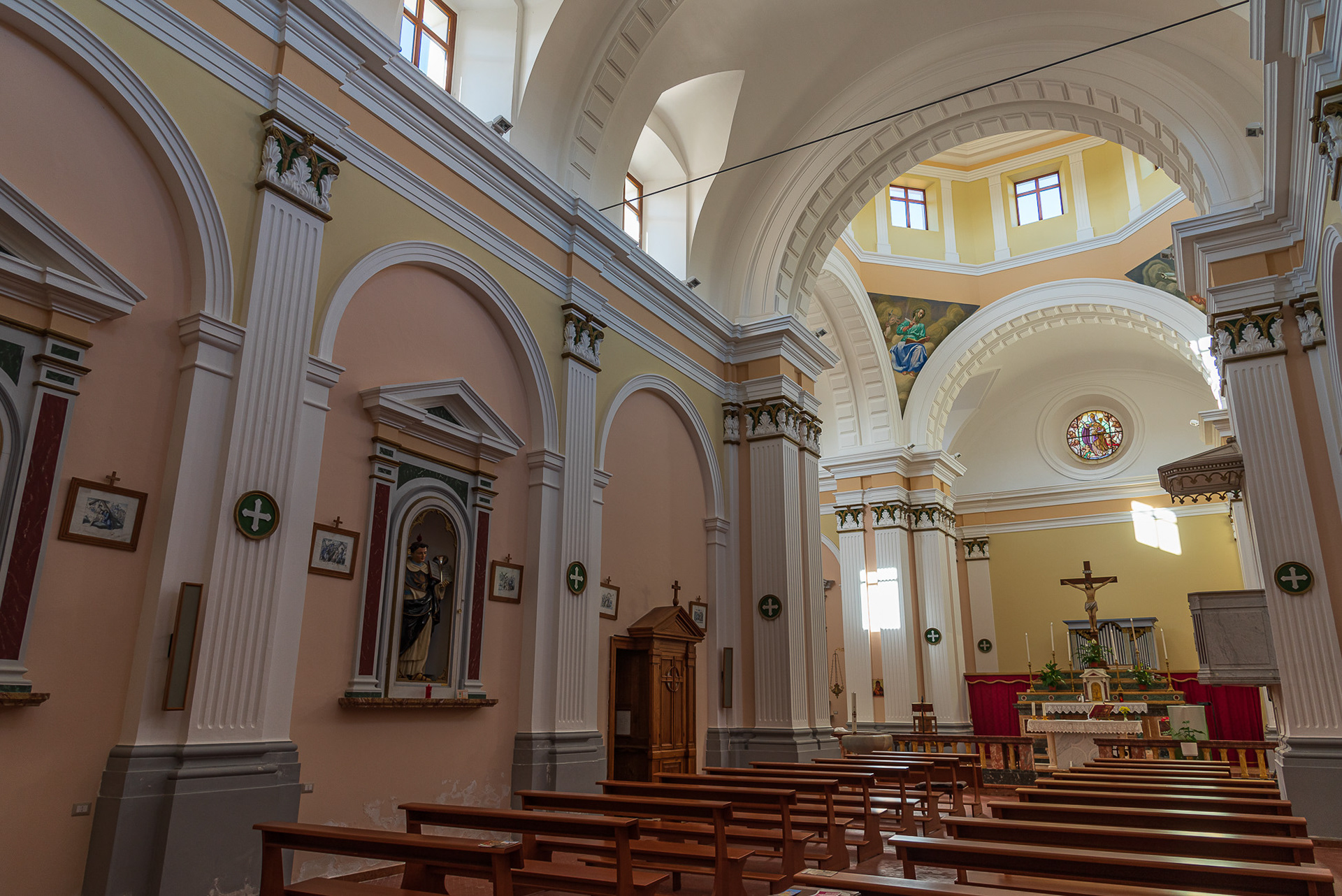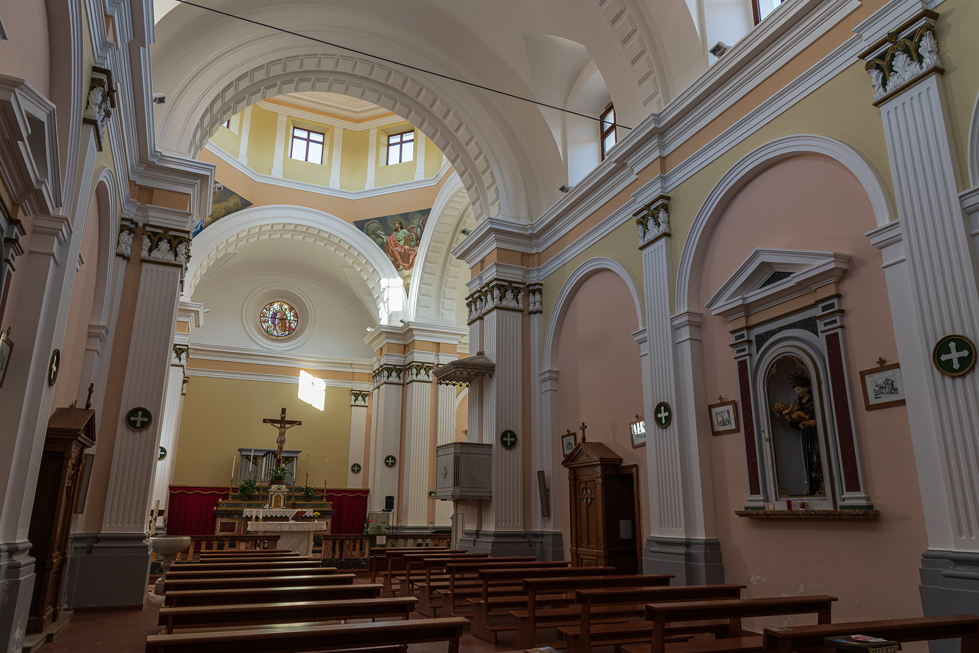 Mother church of San Bartolomeo Apostolo. Formerly dedicated to S. Maria Assunta in cielo. Its shape is a Latin cross, with three naves separated by two rows of columns.