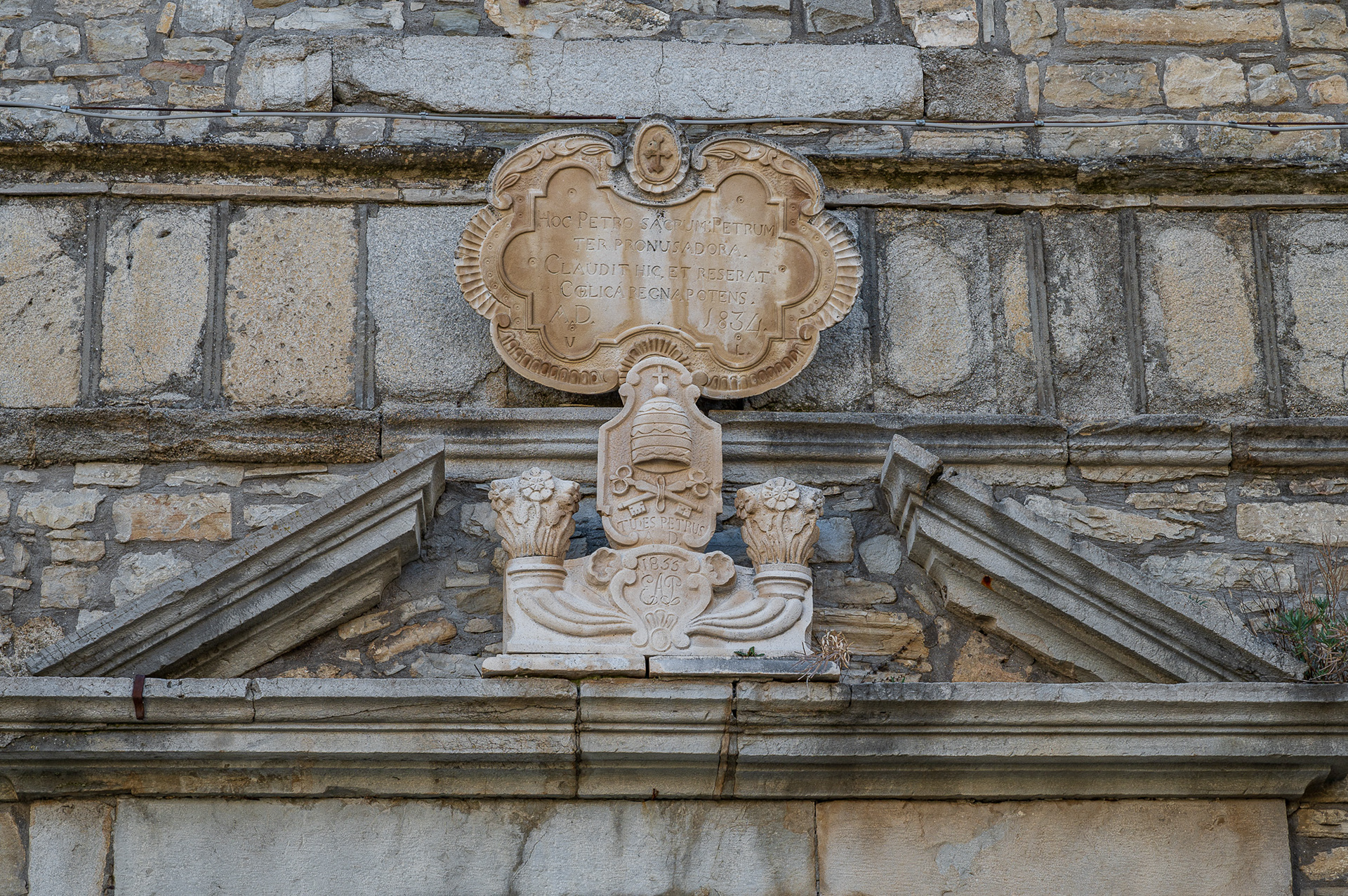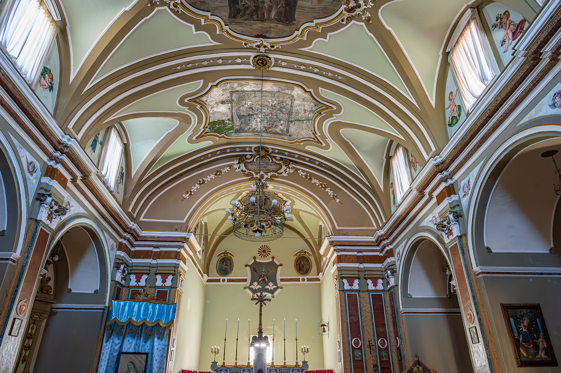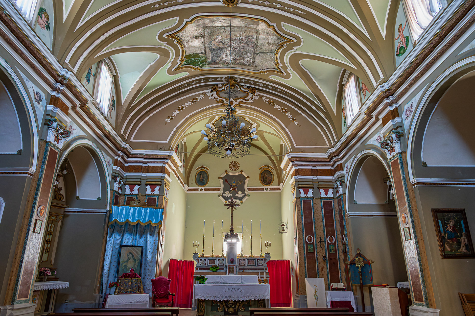 10th century building, as revealed by a document from Montecassino, although today it has an 18th century appearance. A document from 1083, a donation from the Count of Sangro Gualtiero Borrello, contains the name of the prior of the church at the time, a certain Giovanni, who was a priest, Benedictine monk and "hermit", that is, a hermit living in the hermitage of Capo del Verrino. The façade is simple, in stone ashlars, with a portal decorated with a tiara with the keys of Saint Peter, with a Latin inscription above. The bell tower is a tower with a spire adorned with green and yellow tiles. The interior has a single nave, made up of two carved wooden altars, plus the main one near the presbytery. The division into side chapels shows fake columns alternating with arches, characterized by gilded Ionic capitals. Furthermore, near the presbytery there is a dome, decorated with frescoes of the four evangelists near the columns that support it.