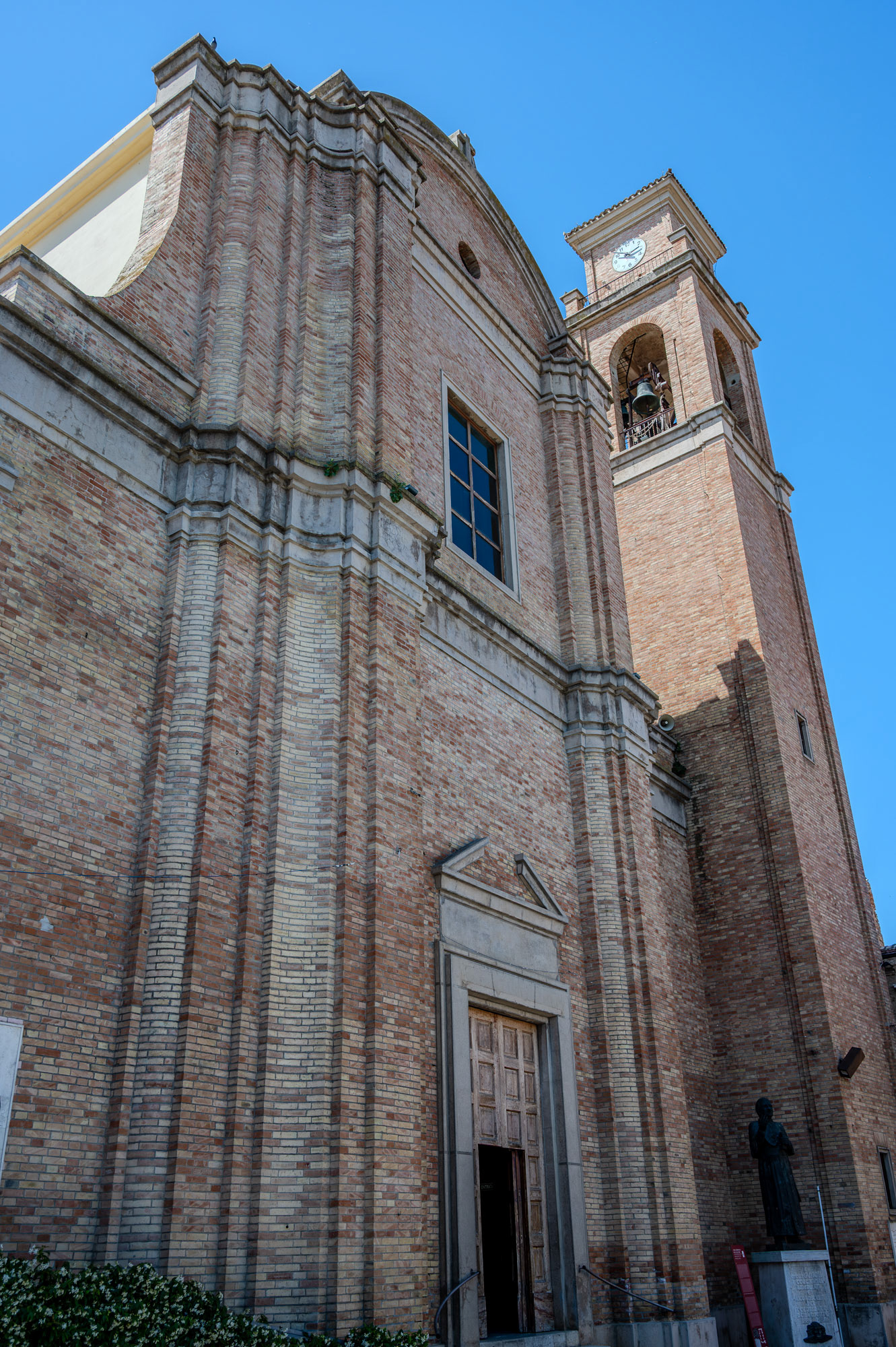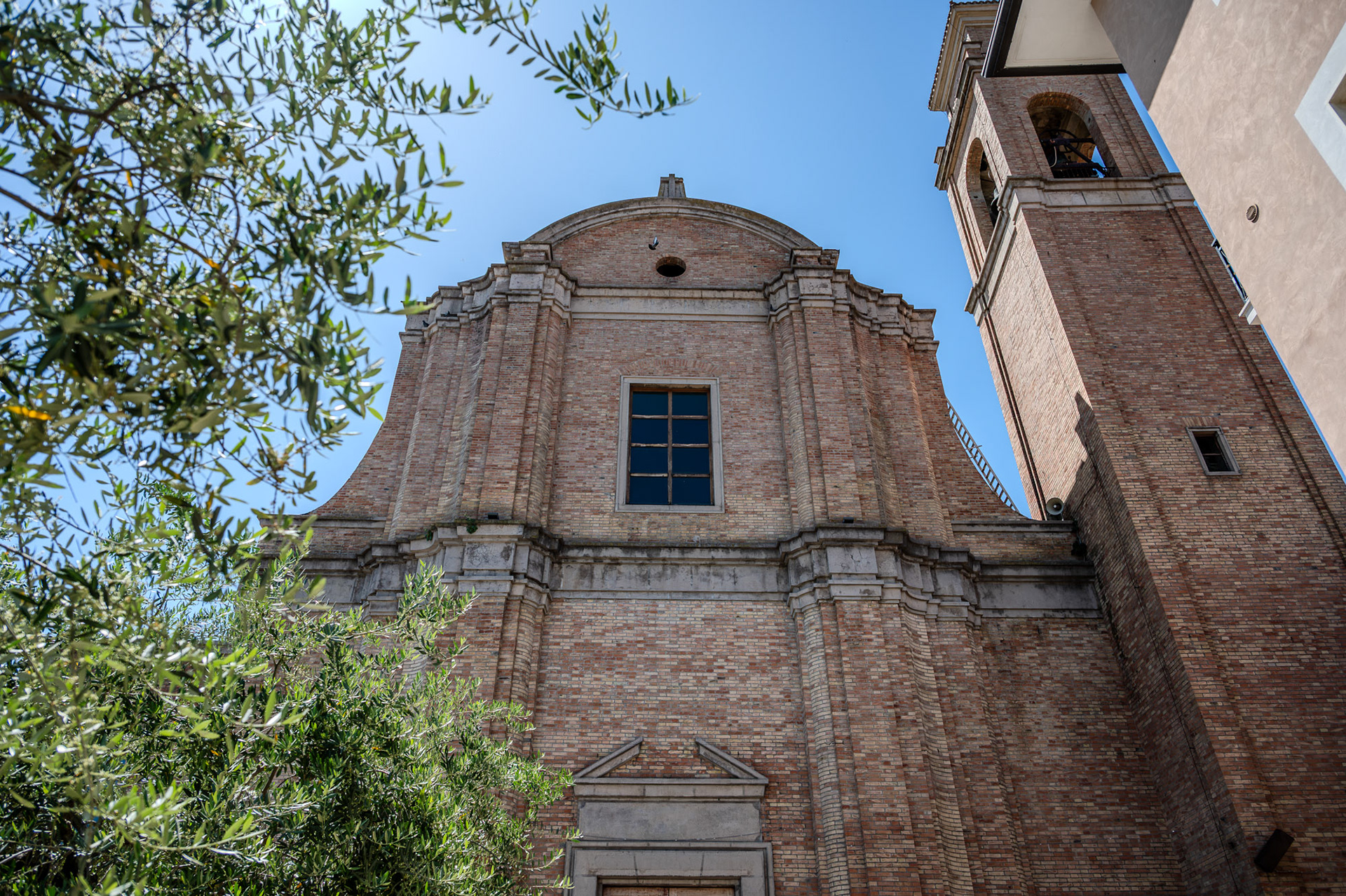 The church has a beautiful baroque brick-clad facade, with a portal surmounted by a broken tympanum and a rectangular window above, and is crowned by a circular tympanum with an oculus.