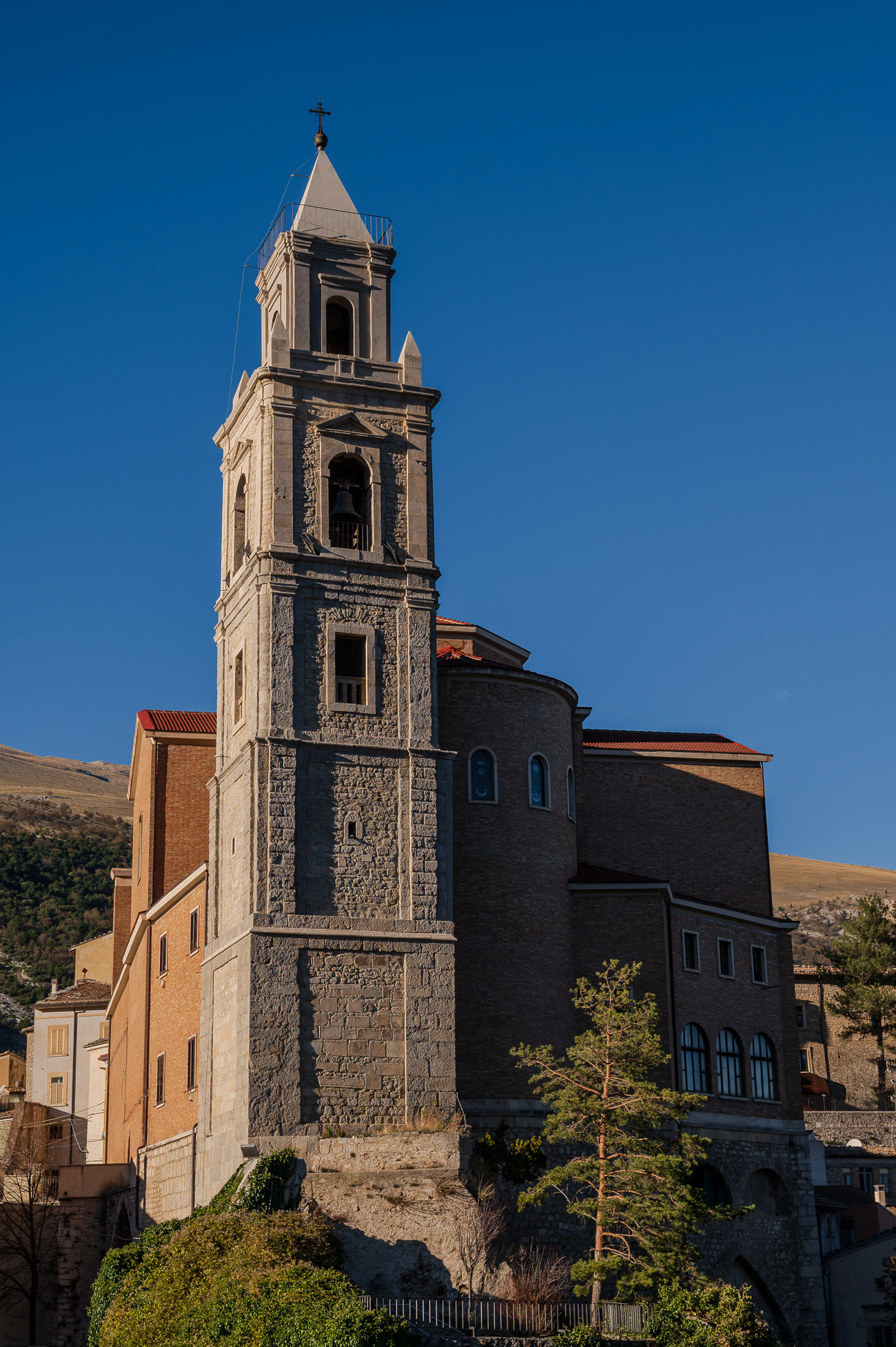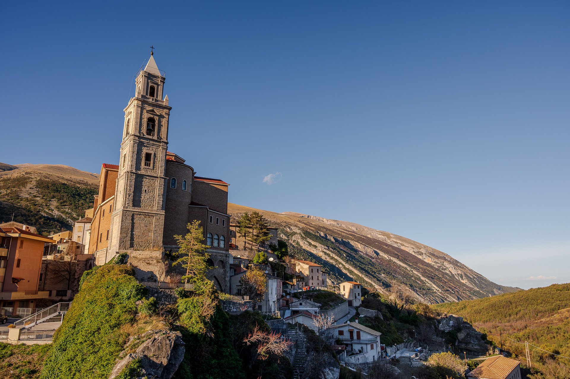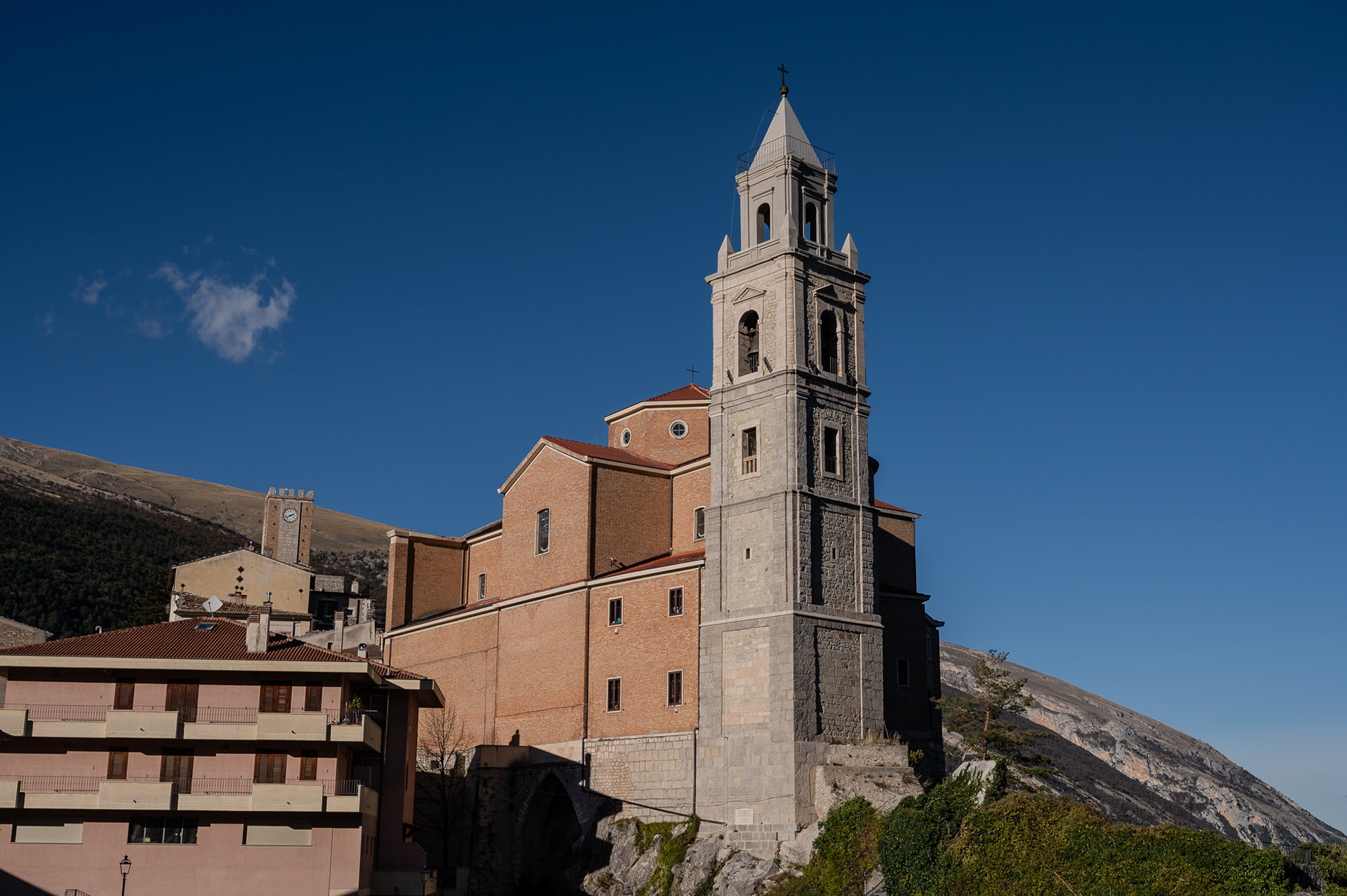 The church of San Pietro in Albe stands on the hill of San Pietro, one of the three hills surrounding Alba Fucens, the Roman city founded in 304 BC at the foot of Mount Velino.