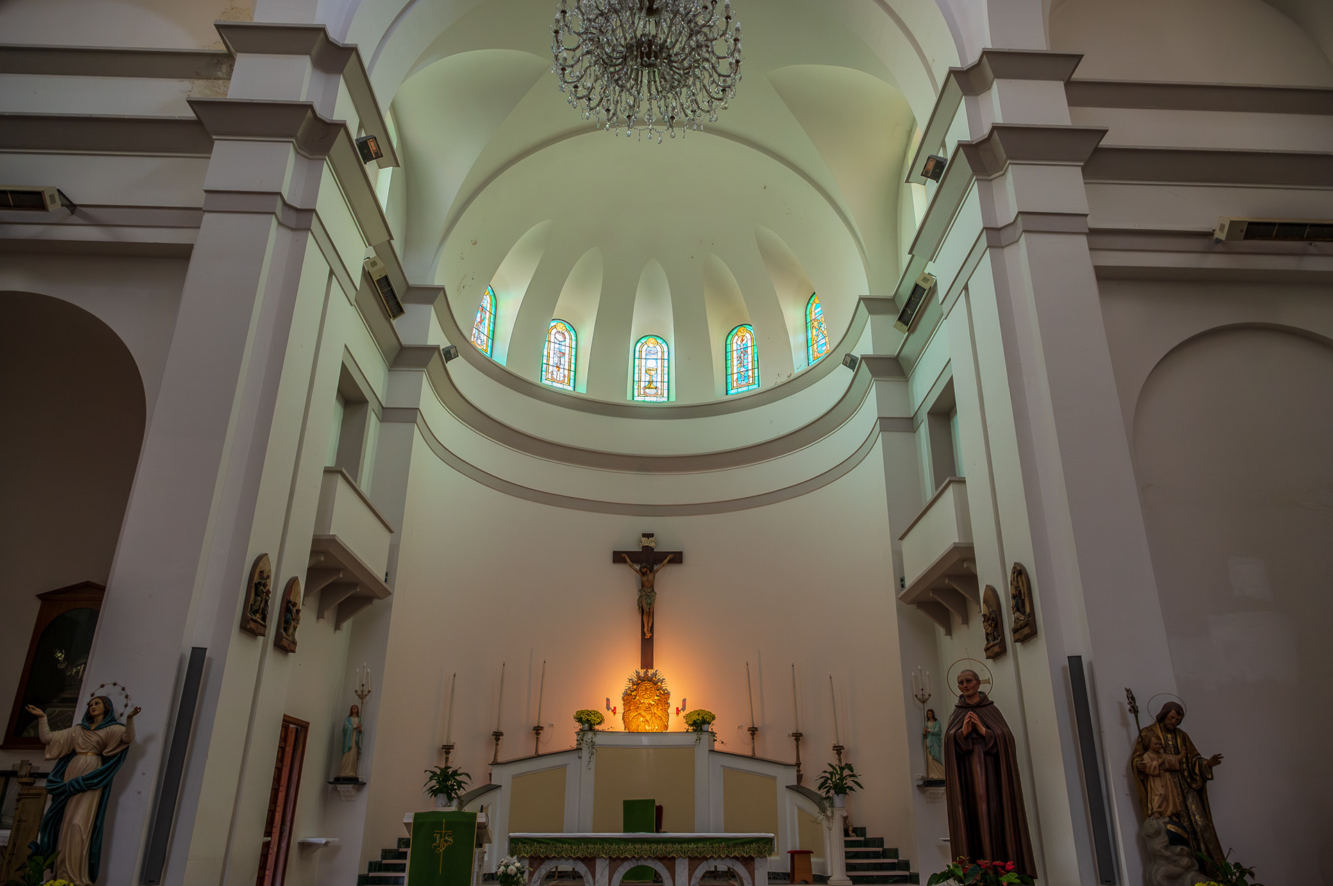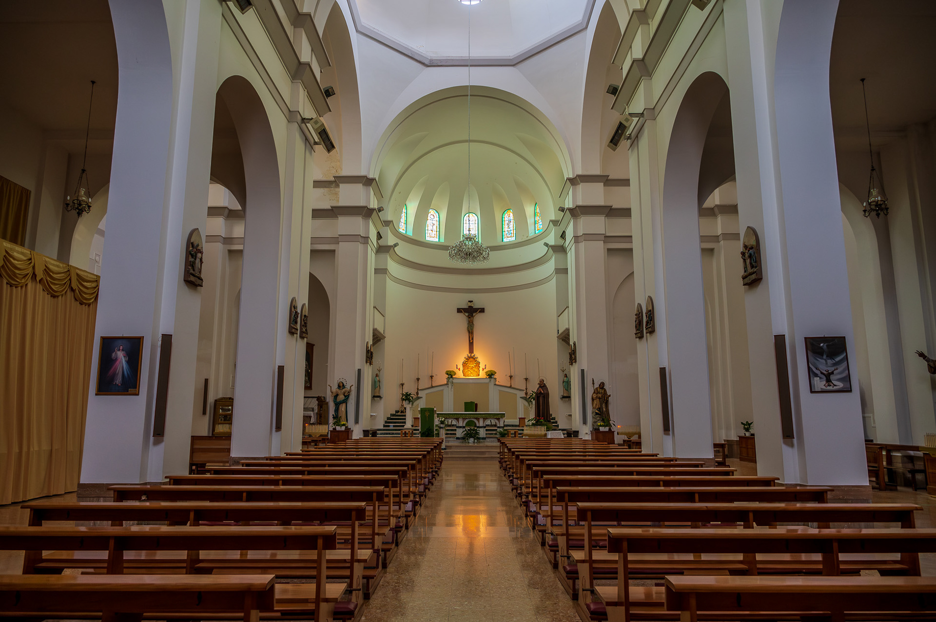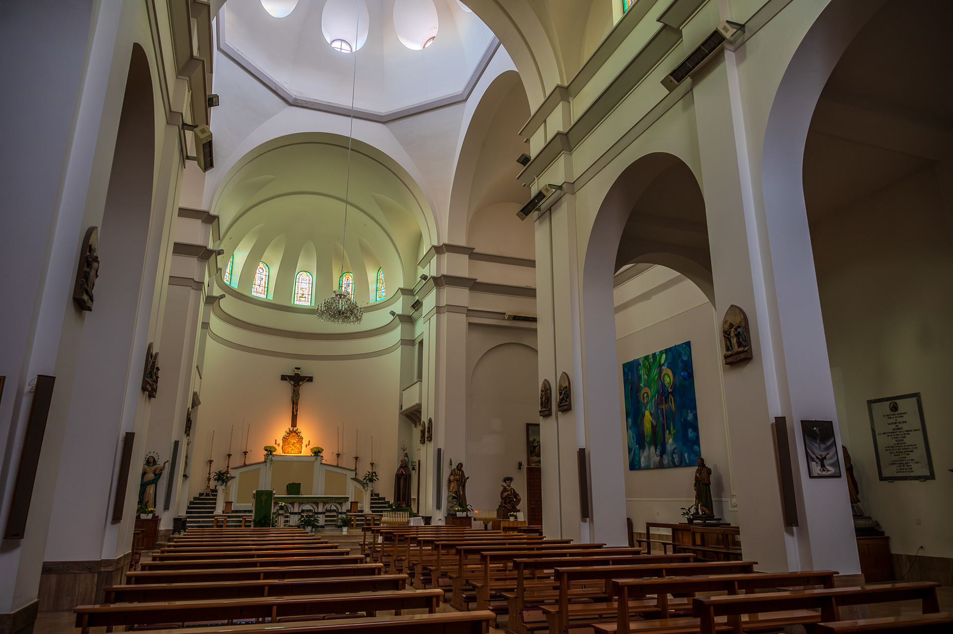 Parish Church of the Child Jesus or of Saints Nicholas and Clemente. The parish church, originally dedicated to SS. Nicola and Clemente, was dedicated in 2015 to the Child Jesus, with a Decree of the archbishop mons. Bruno Strong. It is located in Piazza Umberto I, in front of the town hall. The original building dates back to the 16th century. An epigraph on the bell tower attests that the church was built in 1589 in the eighteenth century two windows were added on the facade for more light. The portico, located on the right side, dates back to the 20th century. The facade is rectangular. A tympanum dominates the portal, while a rose window is decorated with some little heads of angels. The portico has six bays with a round arch. The bell tower has three levels marked on the outside by a stringcourse frame. The interior has three naves, one central and two lateral. In the side aisles there are minor altars, with representations of saints. In the right aisle appear, in order, a niche with St. Sebastian, a first modern altar with an effigy of the Divine Mercy (recently set up), which houses the baptismal font, the latter covered by a late Gothic wooden chest dating back to the nineteenth century. Subsequently there is an altar with Our Lady of Sorrows and the dead Christ, then an altar with St. Anthony of Padua and finally a last one with the representation of the Sacred Heart of Jesus. In the left aisle there is, in order, a first altar with the Madonna del Rosario, then an altar with a painting of the Madonna delle Grazie. Subsequently an altar with S. Cesidio, followed by that in honor of S. Giuseppe. Finally there is a niche with S. Gabriele dell'Addolorata. At the back of the church, on the entrance door, there is a mezzanine supported by four columns, which houses a pipe organ built in the 17th century. At the end to the left of the central nave there is a wooden pulpit, with representations of the life of Jesus. The main altar is located at the end of the central nave, located in the center of the presbytery and is illuminated by the light from the dome. Behind the altar is the urn of the Holy Child, with the tabernacle below.