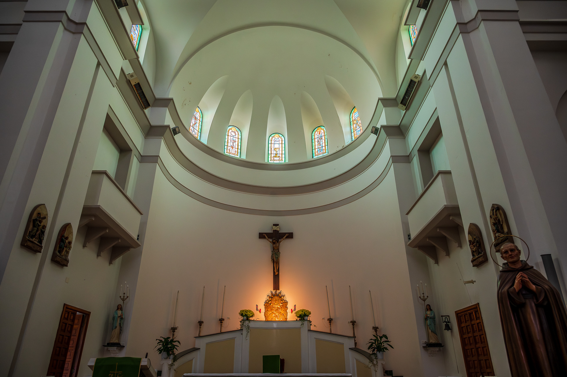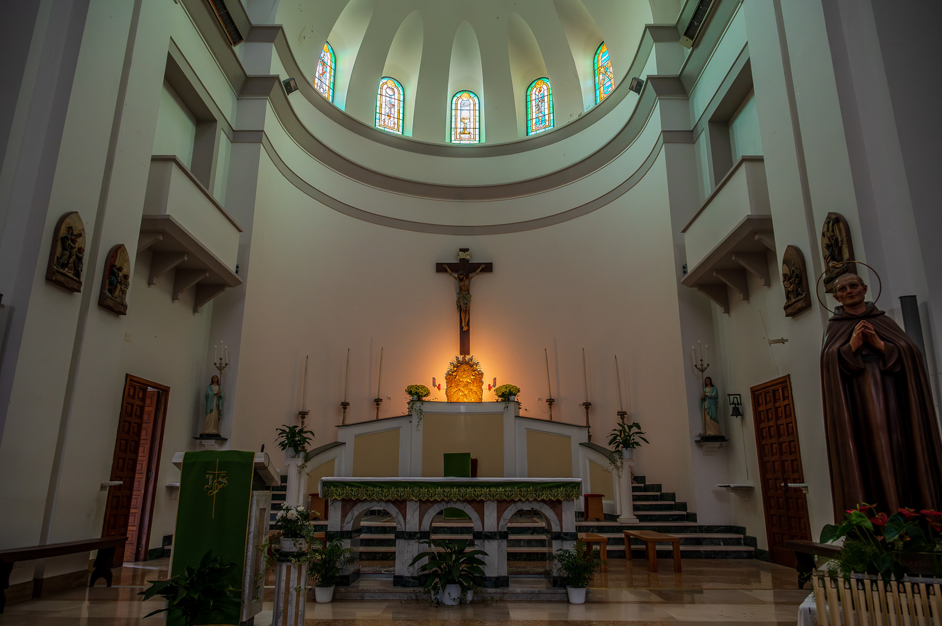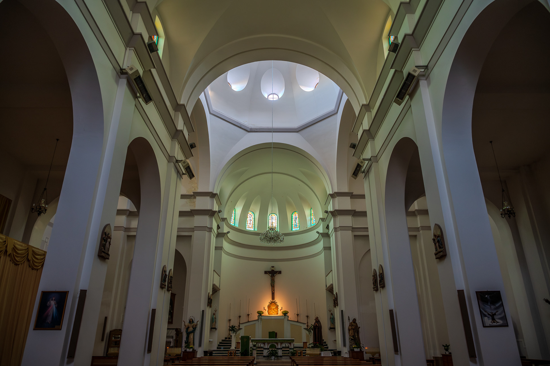 Parish Church of the Child Jesus or of Saints Nicholas and Clemente. The parish church, originally dedicated to SS. Nicola and Clemente, was dedicated in 2015 to the Child Jesus, with a Decree of the archbishop mons. Bruno Strong. It is located in Piazza Umberto I, in front of the town hall. The original building dates back to the 16th century. An epigraph on the bell tower attests that the church was built in 1589 in the eighteenth century two windows were added on the facade for more light. The portico, located on the right side, dates back to the 20th century. The facade is rectangular. A tympanum dominates the portal, while a rose window is decorated with some little heads of angels. The portico has six bays with a round arch. The bell tower has three levels marked on the outside by a stringcourse frame. The interior has three naves, one central and two lateral. In the side aisles there are minor altars, with representations of saints. In the right aisle appear, in order, a niche with St. Sebastian, a first modern altar with an effigy of the Divine Mercy (recently set up), which houses the baptismal font, the latter covered by a late Gothic wooden chest dating back to the nineteenth century. Subsequently there is an altar with Our Lady of Sorrows and the dead Christ, then an altar with St. Anthony of Padua and finally a last one with the representation of the Sacred Heart of Jesus. In the left aisle there is, in order, a first altar with the Madonna del Rosario, then an altar with a painting of the Madonna delle Grazie. Subsequently an altar with S. Cesidio, followed by that in honor of S. Giuseppe. Finally there is a niche with S. Gabriele dell'Addolorata. At the back of the church, on the entrance door, there is a mezzanine supported by four columns, which houses a pipe organ built in the 17th century. At the end to the left of the central nave there is a wooden pulpit, with representations of the life of Jesus. The main altar is located at the end of the central nave, located in the center of the presbytery and is illuminated by the light from the dome. Behind the altar is the urn of the Holy Child, with the tabernacle below.