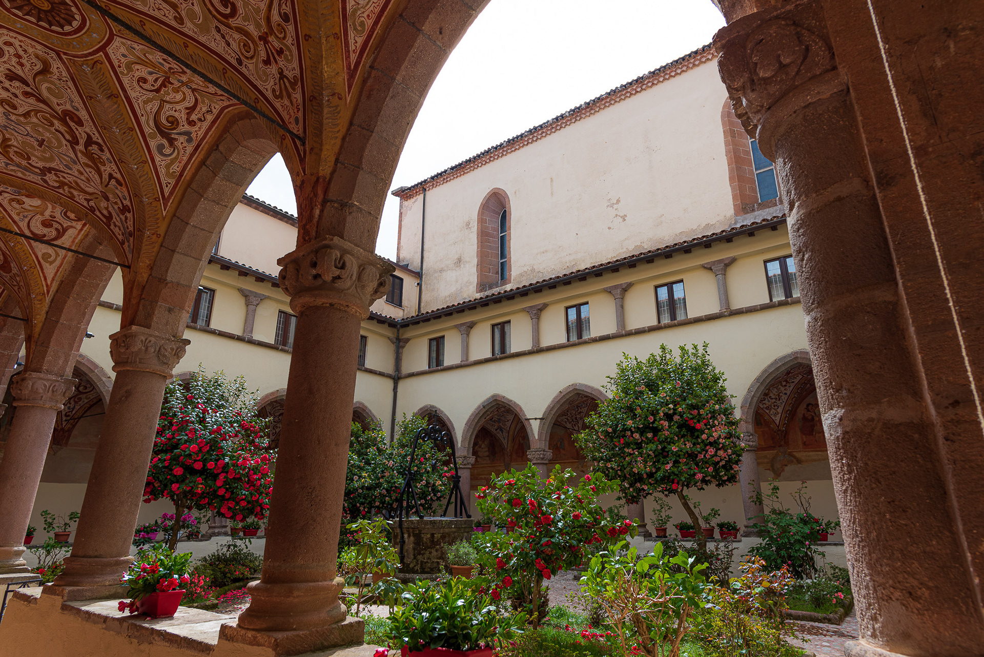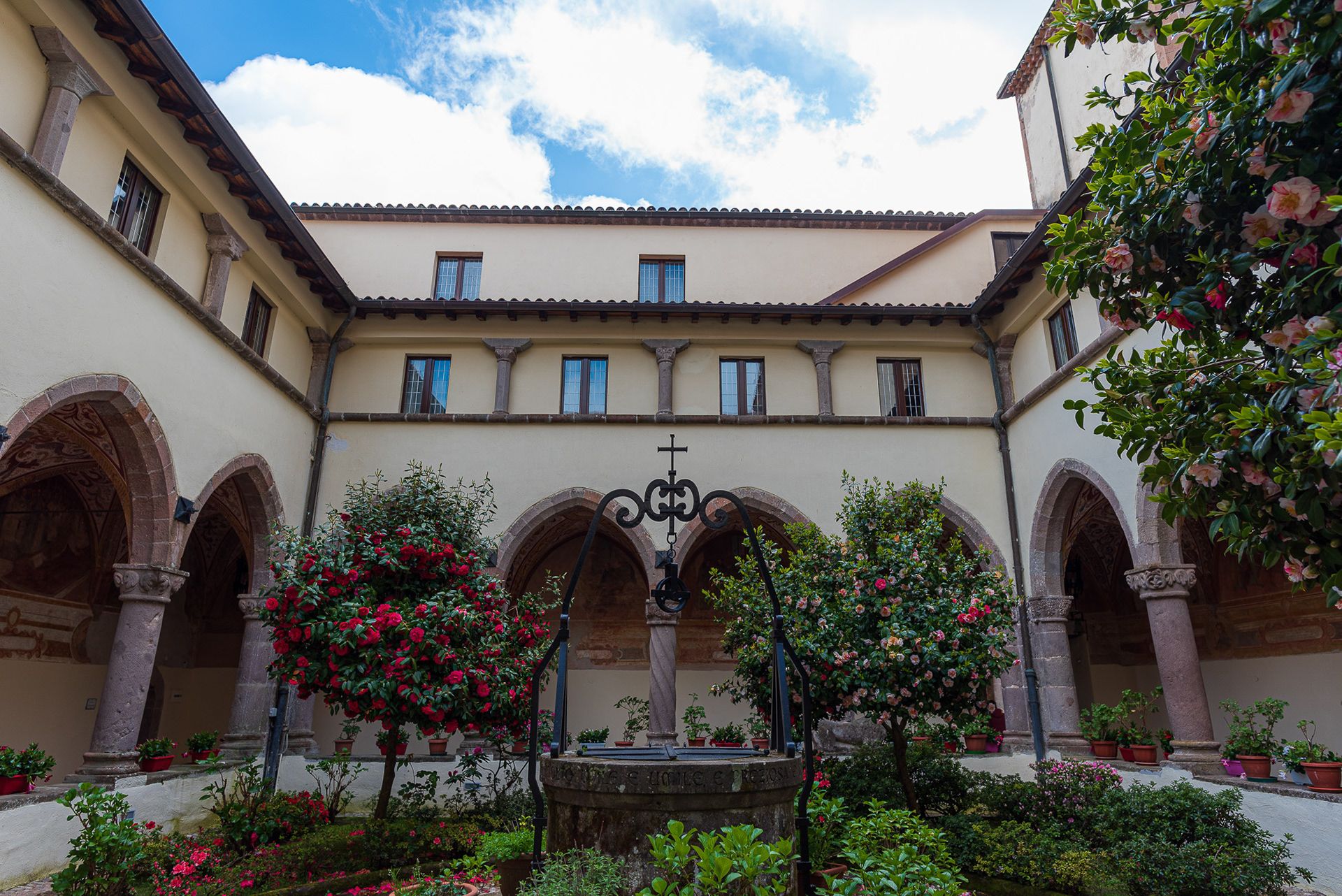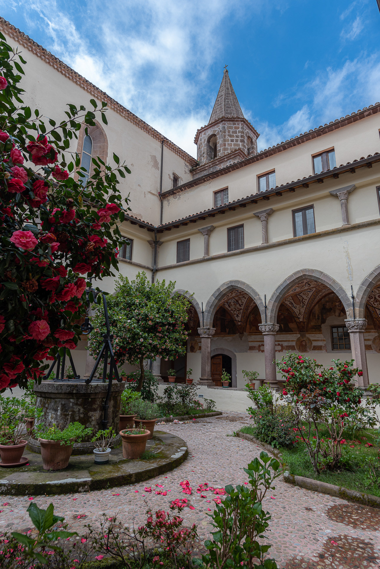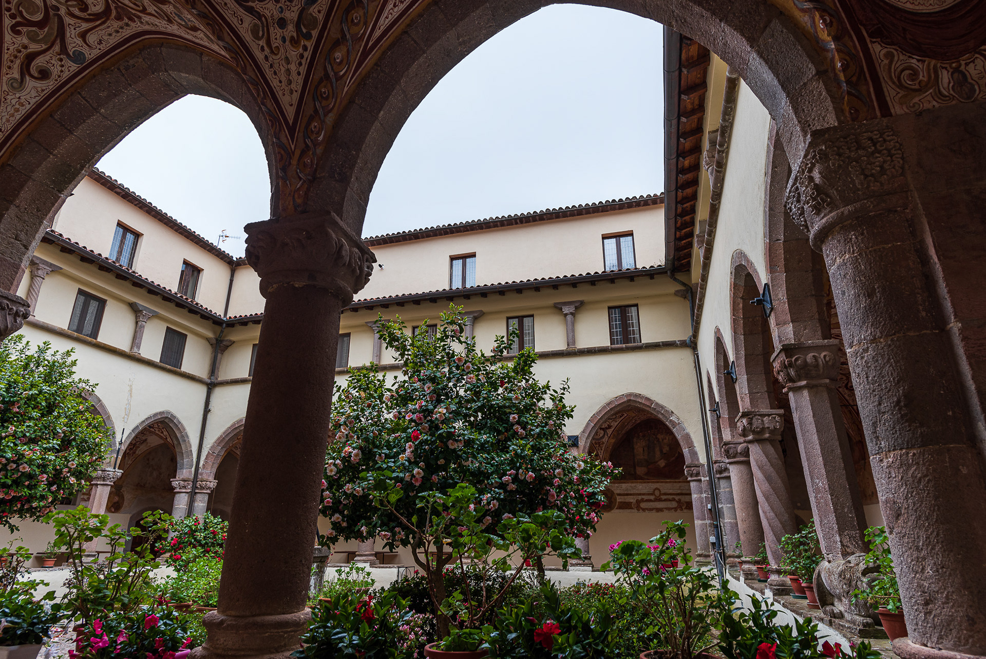 The cathedral, originally dedicated to San Terenziano, was later named after San Clemente. Construction began in 1050 by Bishop Guglielmo, to replace the old cathedral of San Paride ad Fontem, located outside the city walls. The works were completed in 1116 by Bishop Pandulfo. The building has a basilica structure divided into three naves by two rows of columns. In 1608 it was damaged internally by a fire that almost completely destroyed the cosmates ambo, subsequently recomposed using the remains of the previous one integrated with the marble slabs of a fourteenth-century sepulchral monument already present in the church and positioned on twisted columns, two of which rested on fountain lions. During the 16th century the Romanesque apse was modified and on that occasion a precious carved wooden choir was built in the presbytery, built in 1539 by the Benedictine Antonio Maria Sertorio. The choir underwent two restorations, the first in the 17th century and the second in 1957, following the damage suffered during the Second World War.