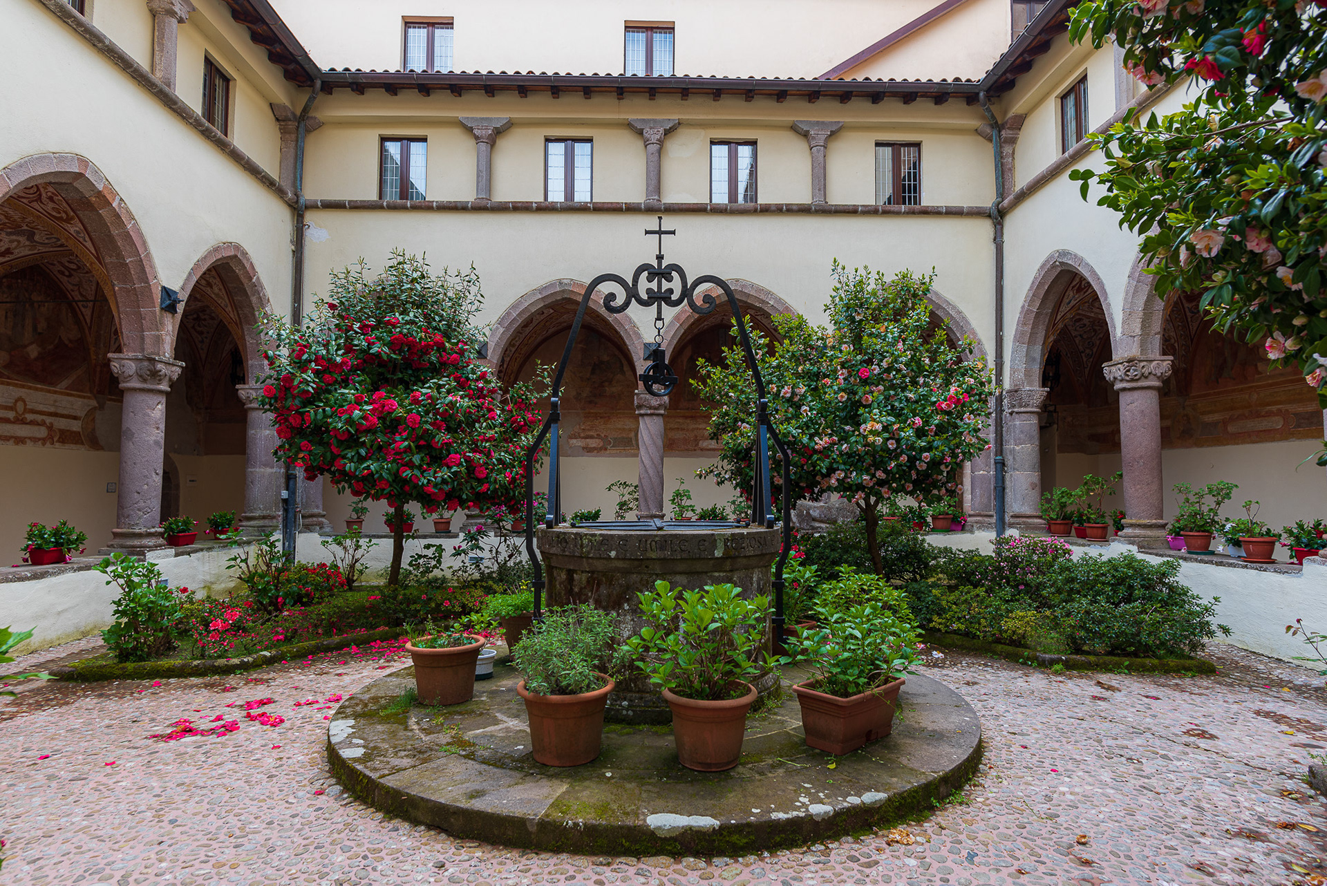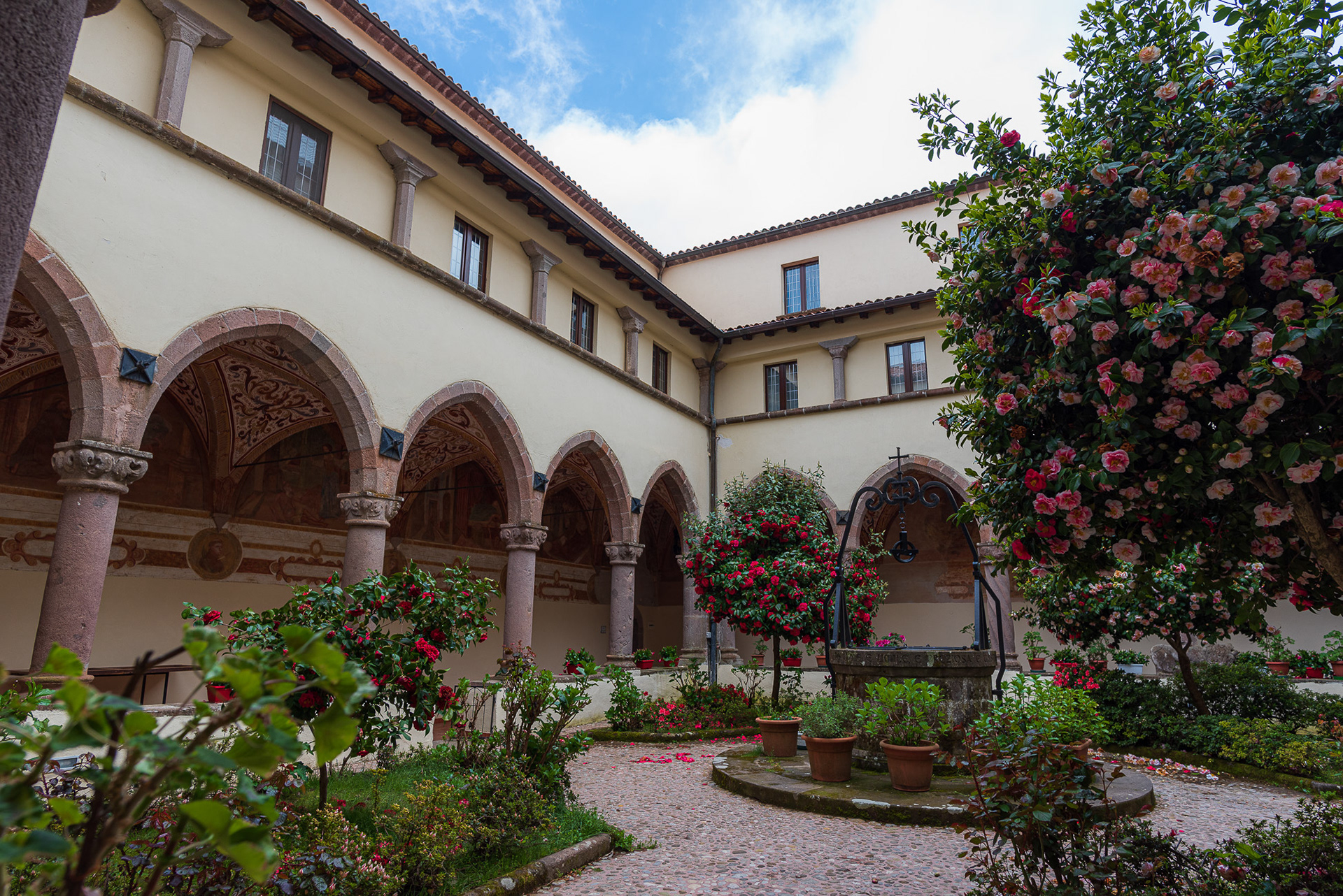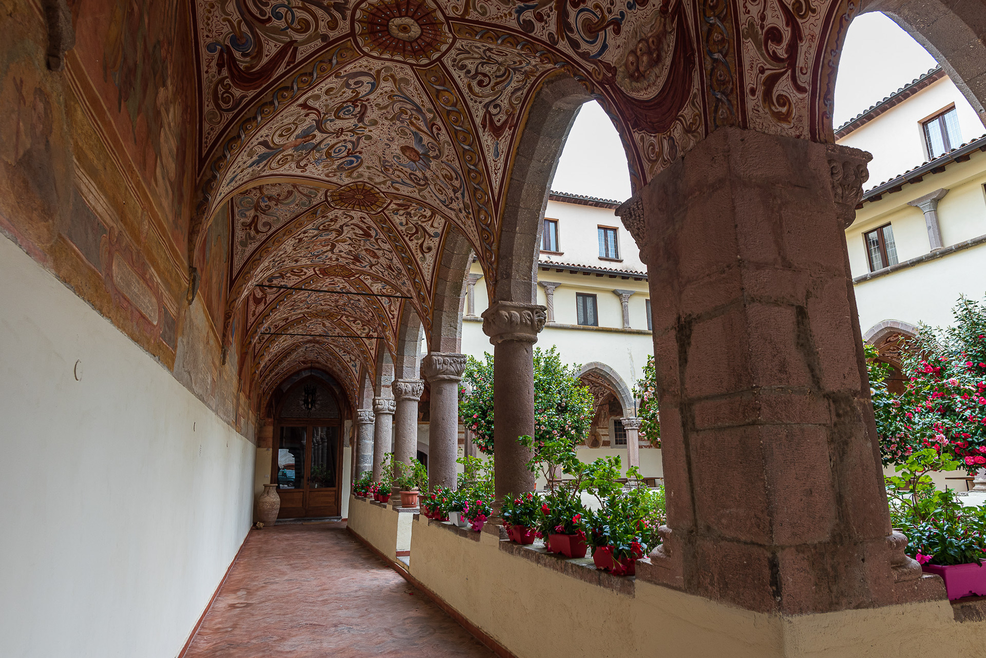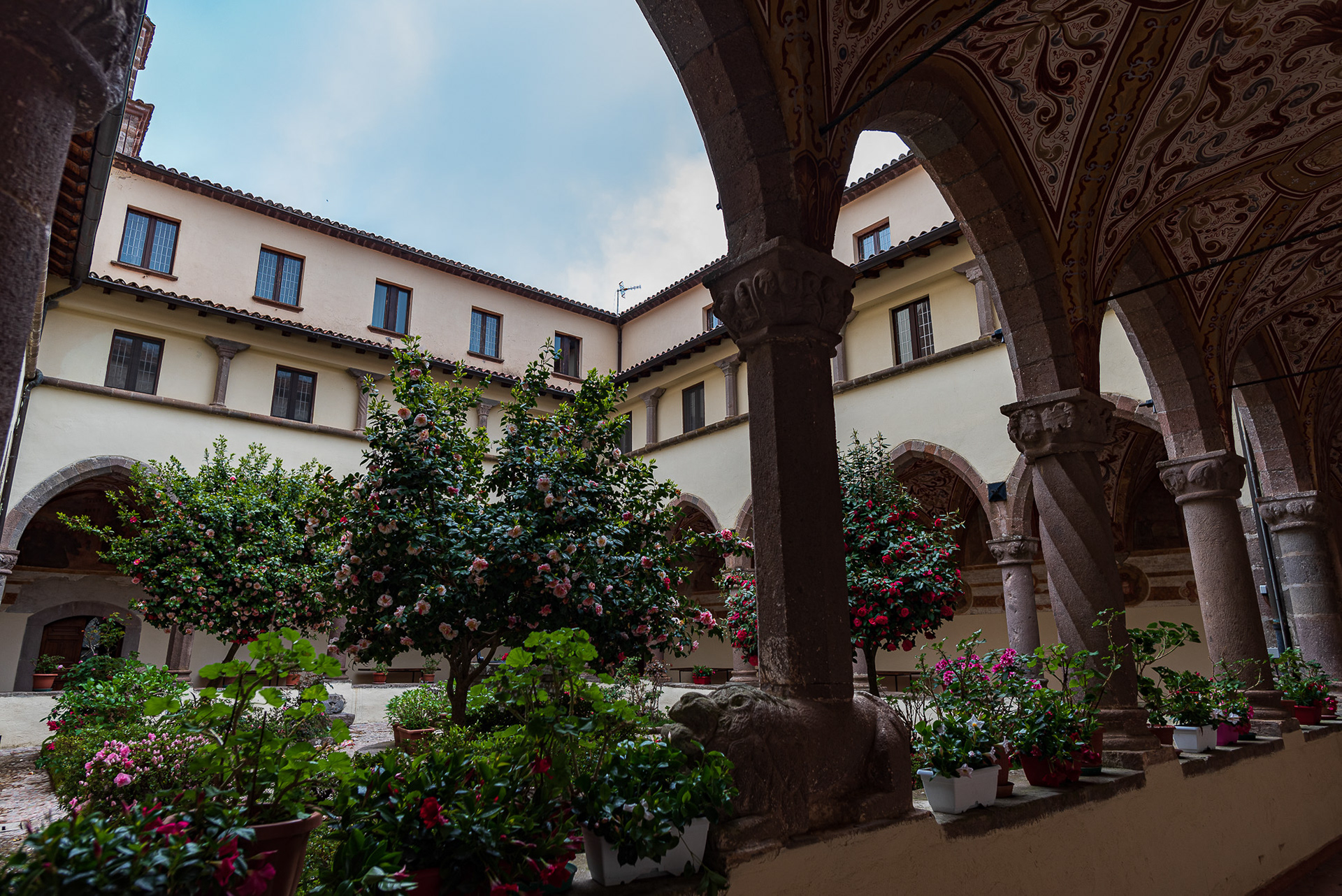 The cathedral, originally dedicated to San Terenziano, was later named after San Clemente. Construction began in 1050 by Bishop Guglielmo, to replace the old cathedral of San Paride ad Fontem, located outside the city walls. The works were completed in 1116 by Bishop Pandulfo. The building has a basilica structure divided into three naves by two rows of columns. In 1608 it was damaged internally by a fire that almost completely destroyed the cosmates ambo, subsequently recomposed using the remains of the previous one integrated with the marble slabs of a fourteenth-century sepulchral monument already present in the church and positioned on twisted columns, two of which rested on fountain lions. During the 16th century the Romanesque apse was modified and on that occasion a precious carved wooden choir was built in the presbytery, built in 1539 by the Benedictine Antonio Maria Sertorio. The choir underwent two restorations, the first in the 17th century and the second in 1957, following the damage suffered during the Second World War.