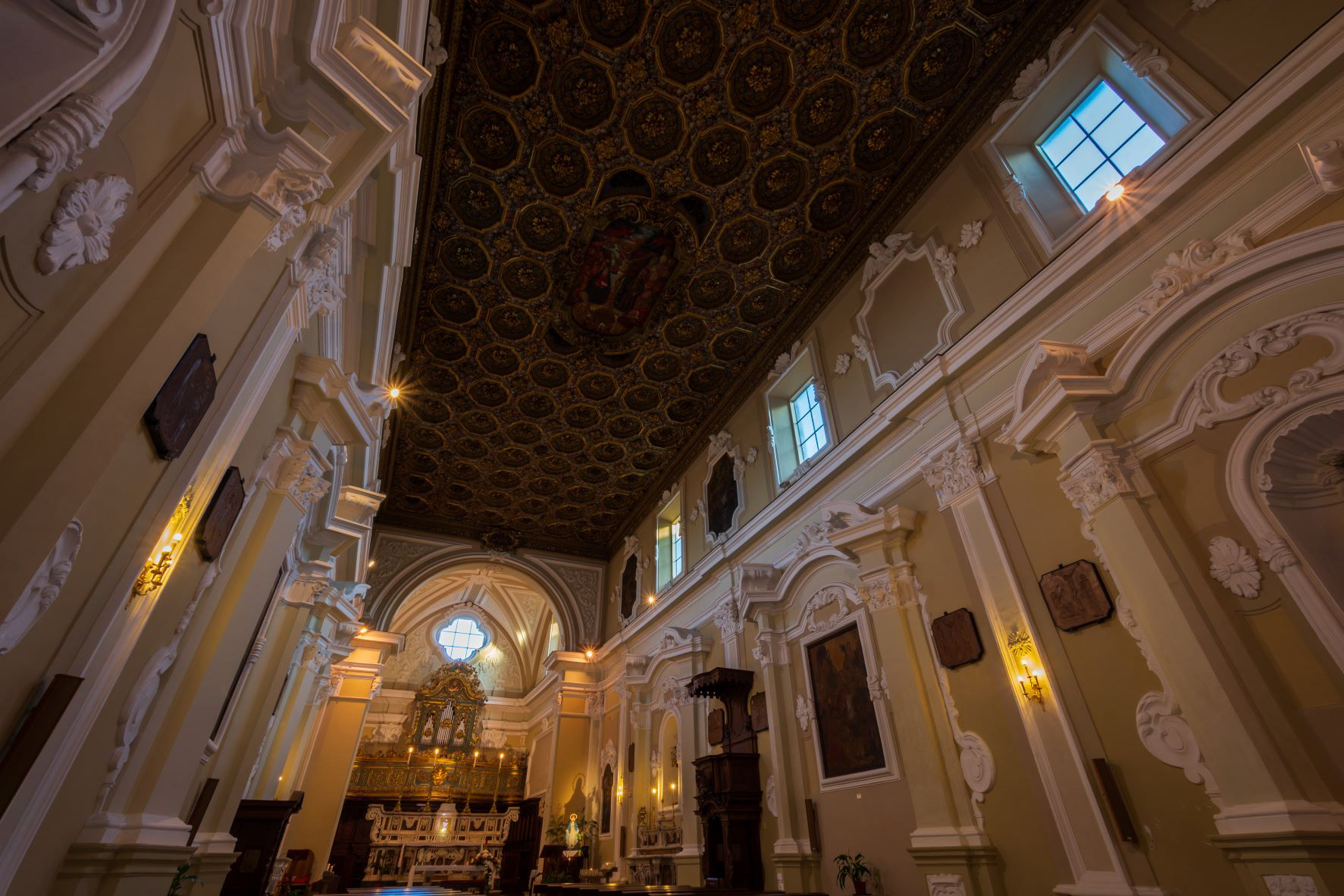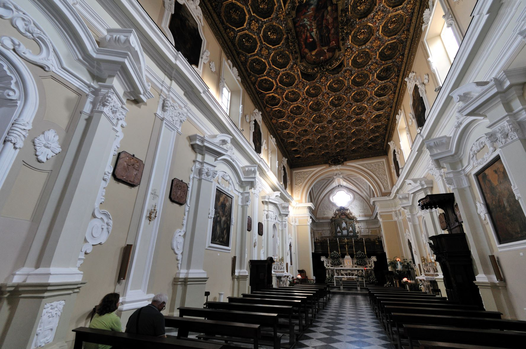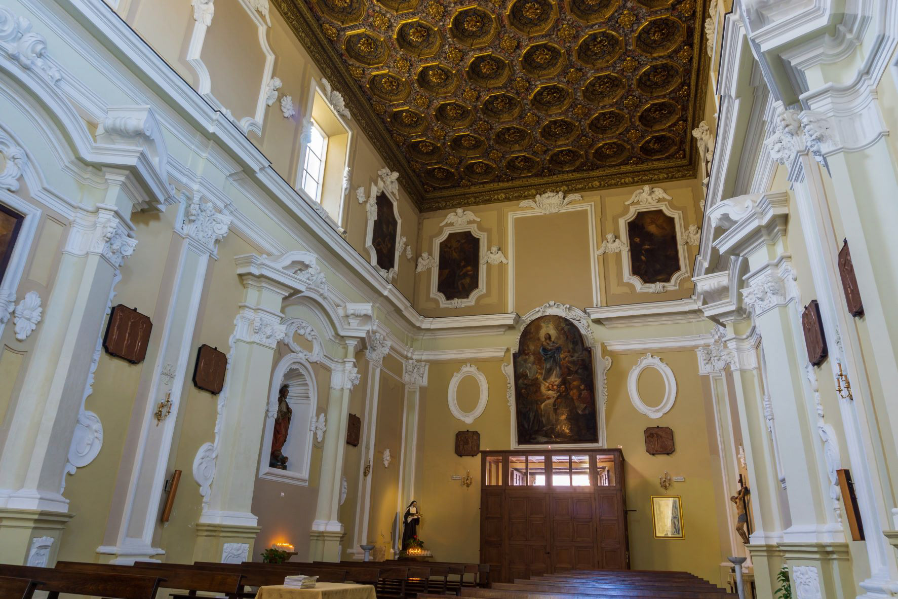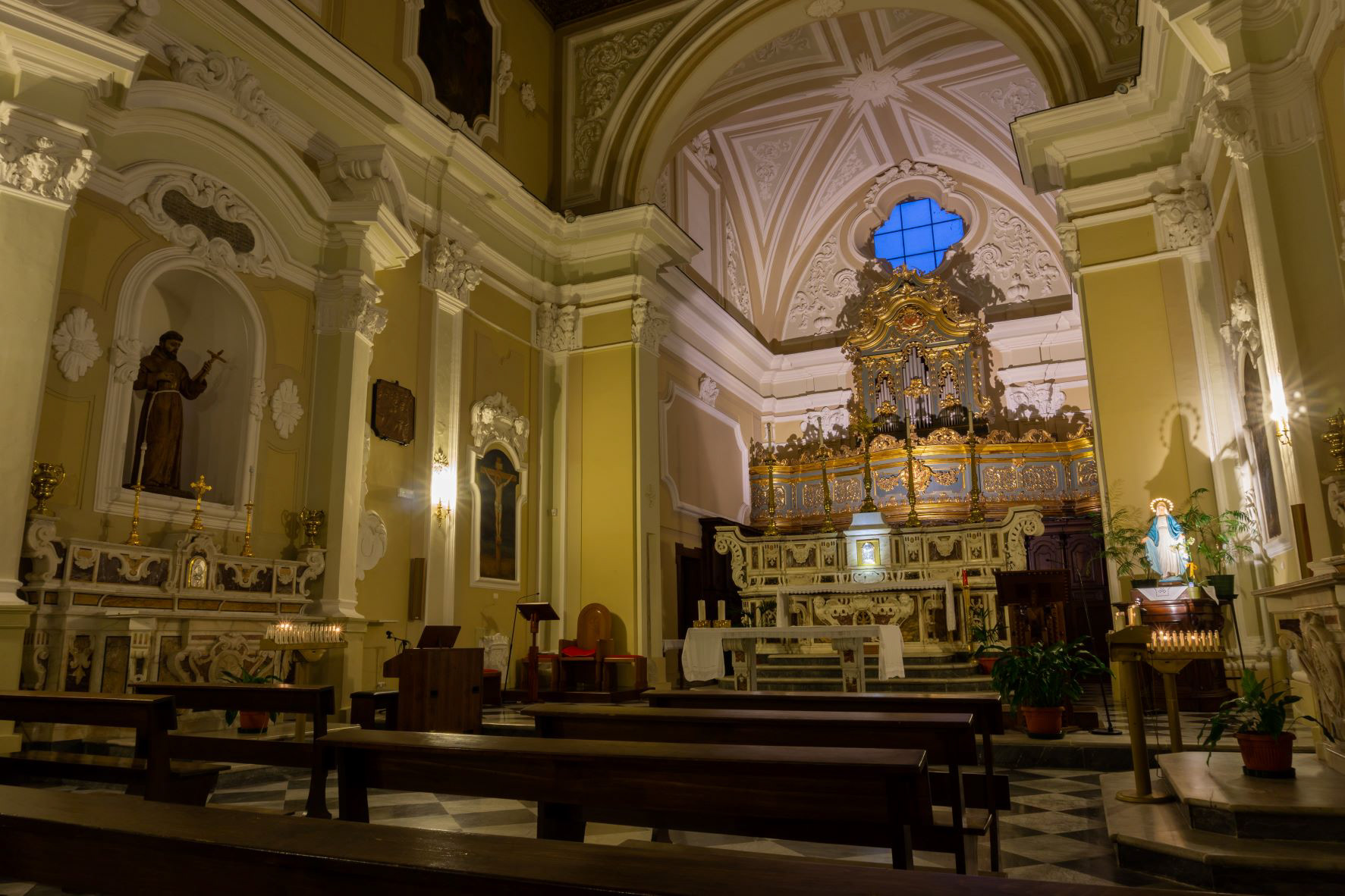 Built in the fourteenth century, in Gothic style, by the Conventual Minors it was extensively remodeled in the Baroque age. The magnificent gilded wooden ceiling with one hundred finely carved coffers, with outlines decorated with wreaths of painted roses, for the splendor of the gilded mass wins the comparison with many other similar works. The panel in the center of the ceiling (St. Francis and the council), in which the popes Pius XII, John XXIII and Paul VI and the late bishop of Teano Mons. Sperandeo are depicted, is a modern work by Augusto De Rose. On the entrance door there is a large canvas of the Immaculate Conception by Girolamo Cenatiempo (first half of the 18th century).