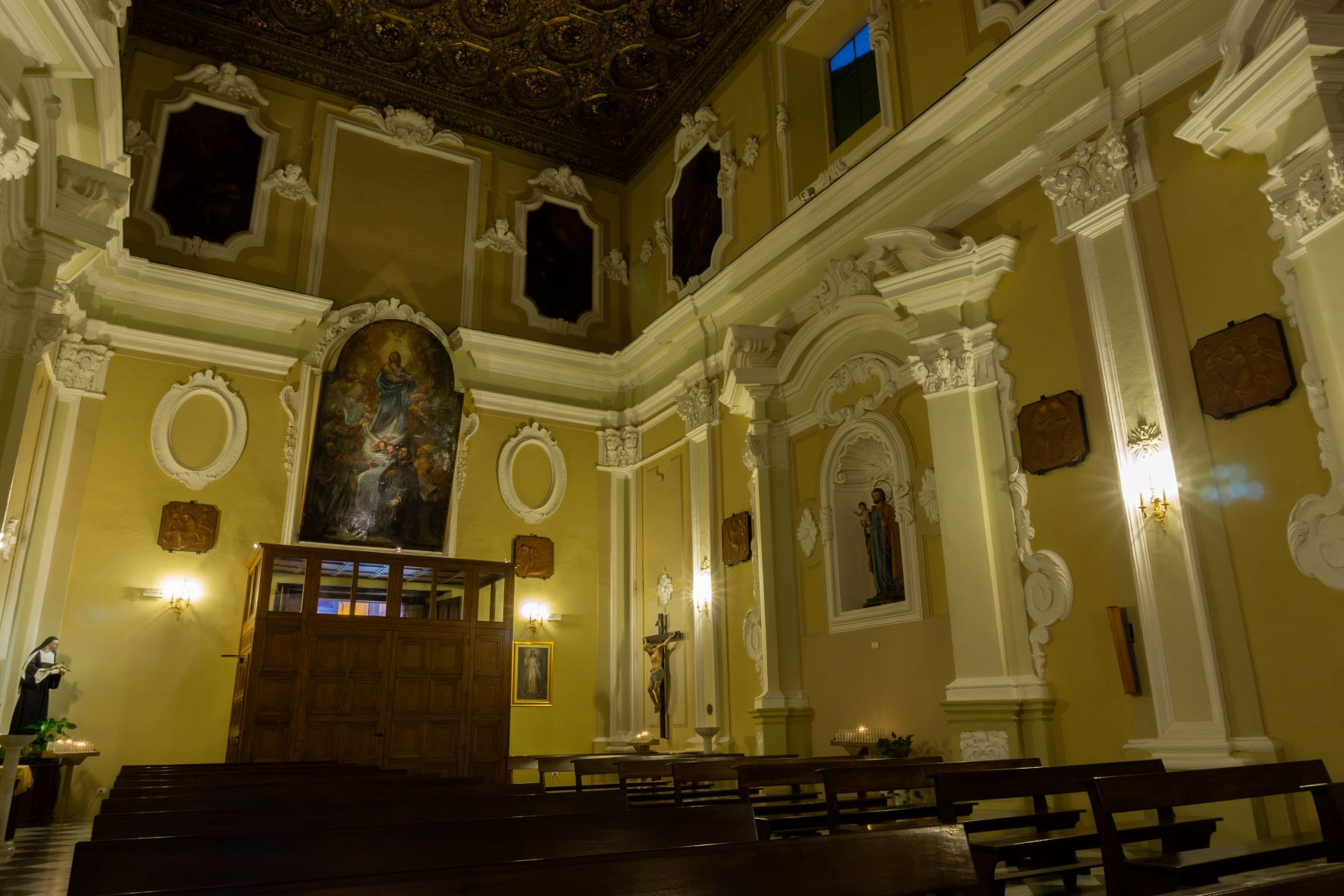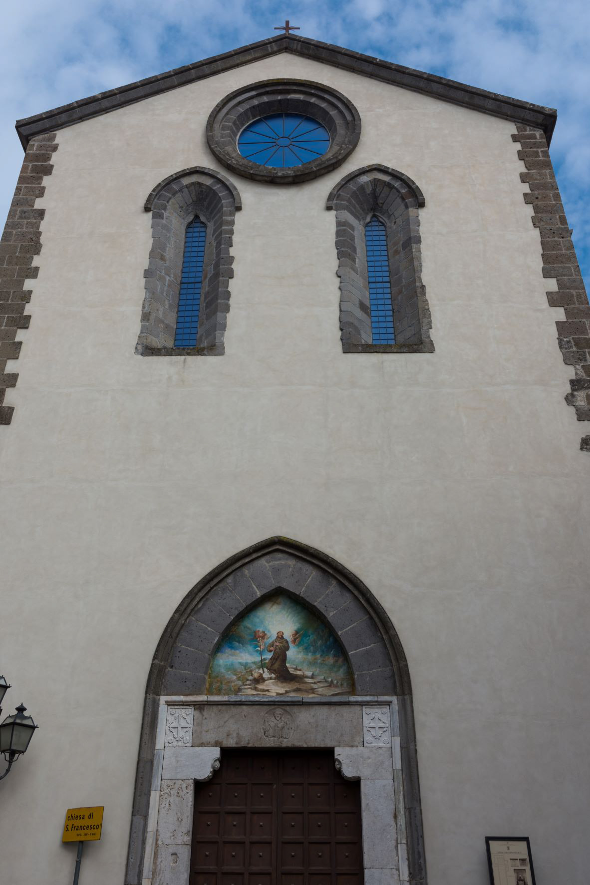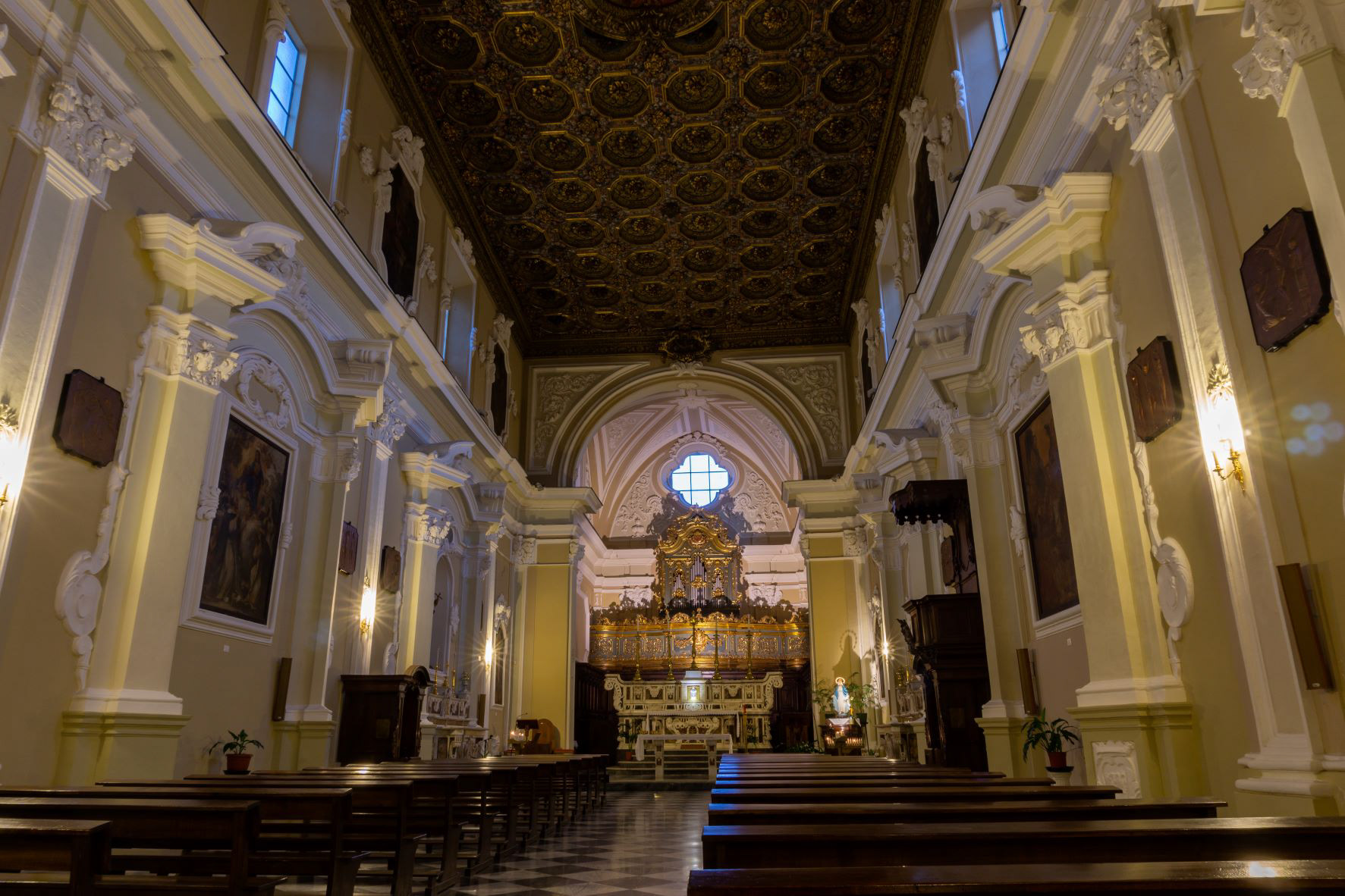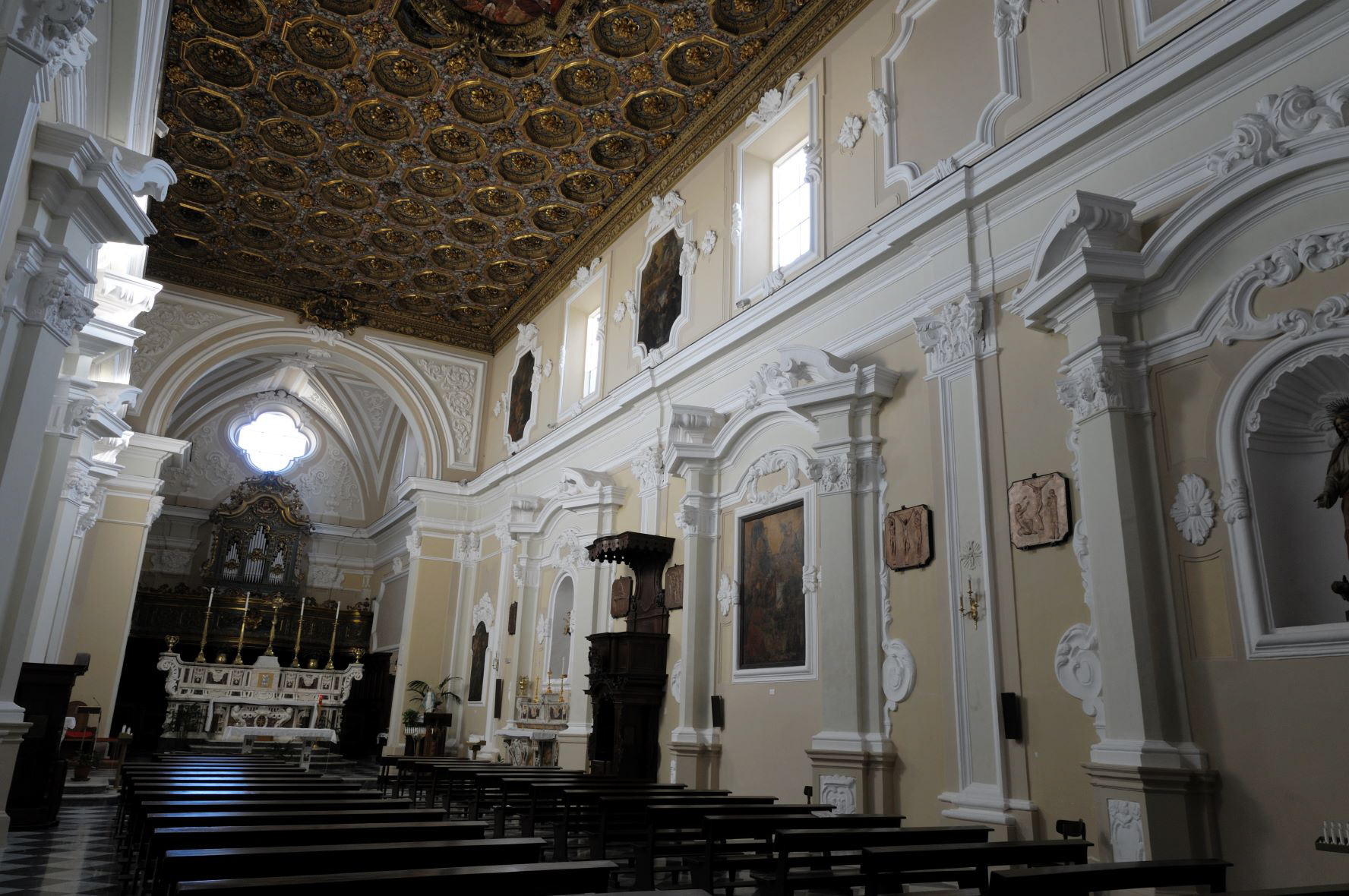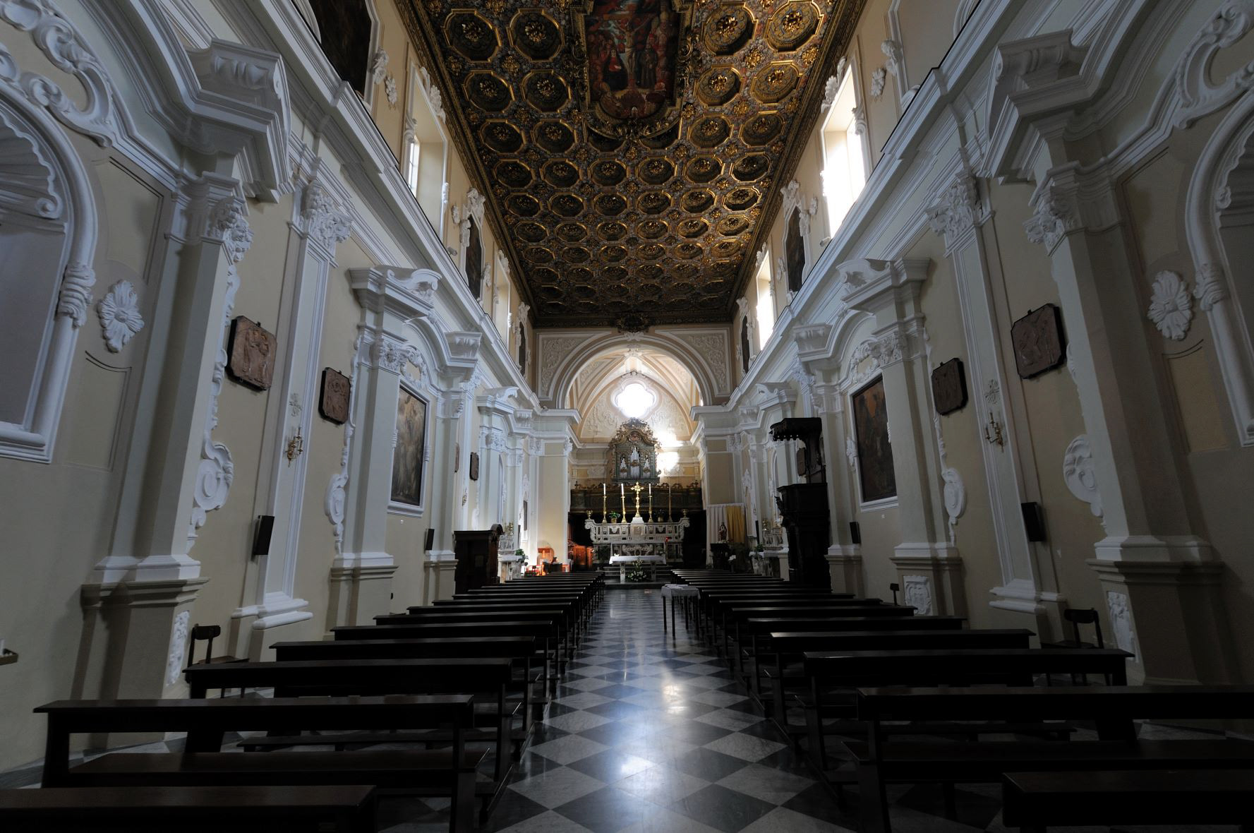 Built in the fourteenth century, in Gothic style, by the Conventual Minors it was extensively remodeled in the Baroque age. The magnificent gilded wooden ceiling with one hundred finely carved coffers, with outlines decorated with wreaths of painted roses, for the splendor of the gilded mass wins the comparison with many other similar works. The panel in the center of the ceiling (St. Francis and the council), in which the popes Pius XII, John XXIII and Paul VI and the late bishop of Teano Mons. Sperandeo are depicted, is a modern work by Augusto De Rose. On the entrance door there is a large canvas of the Immaculate Conception by Girolamo Cenatiempo (first half of the 18th century).
