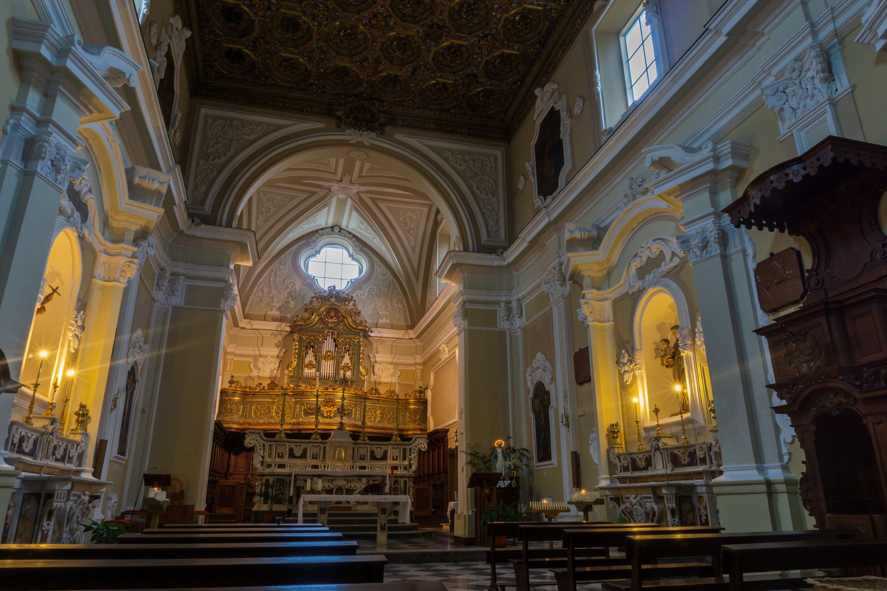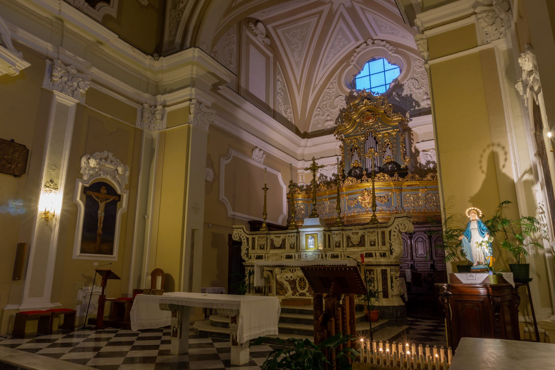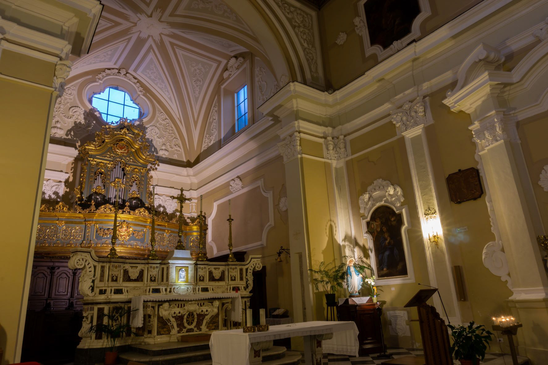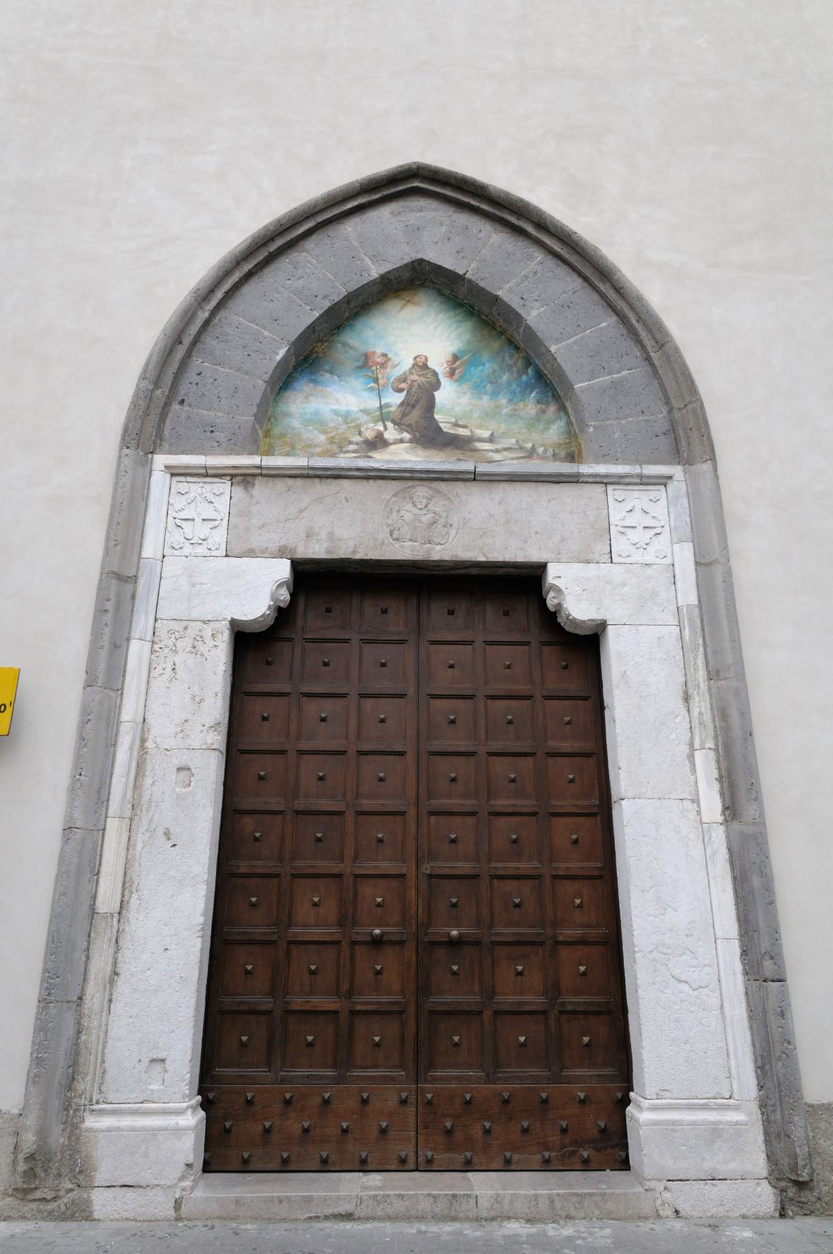 Built in the fourteenth century, in Gothic style, by the Conventual Minors it was extensively remodeled in the Baroque age. The magnificent gilded wooden ceiling with one hundred finely carved coffers, with outlines decorated with wreaths of painted roses, for the splendor of the gilded mass wins the comparison with many other similar works. The panel in the center of the ceiling (St. Francis and the council), in which the popes Pius XII, John XXIII and Paul VI and the late bishop of Teano Mons. Sperandeo are depicted, is a modern work by Augusto De Rose. On the entrance door there is a large canvas of the Immaculate Conception by Girolamo Cenatiempo (first half of the 18th century).