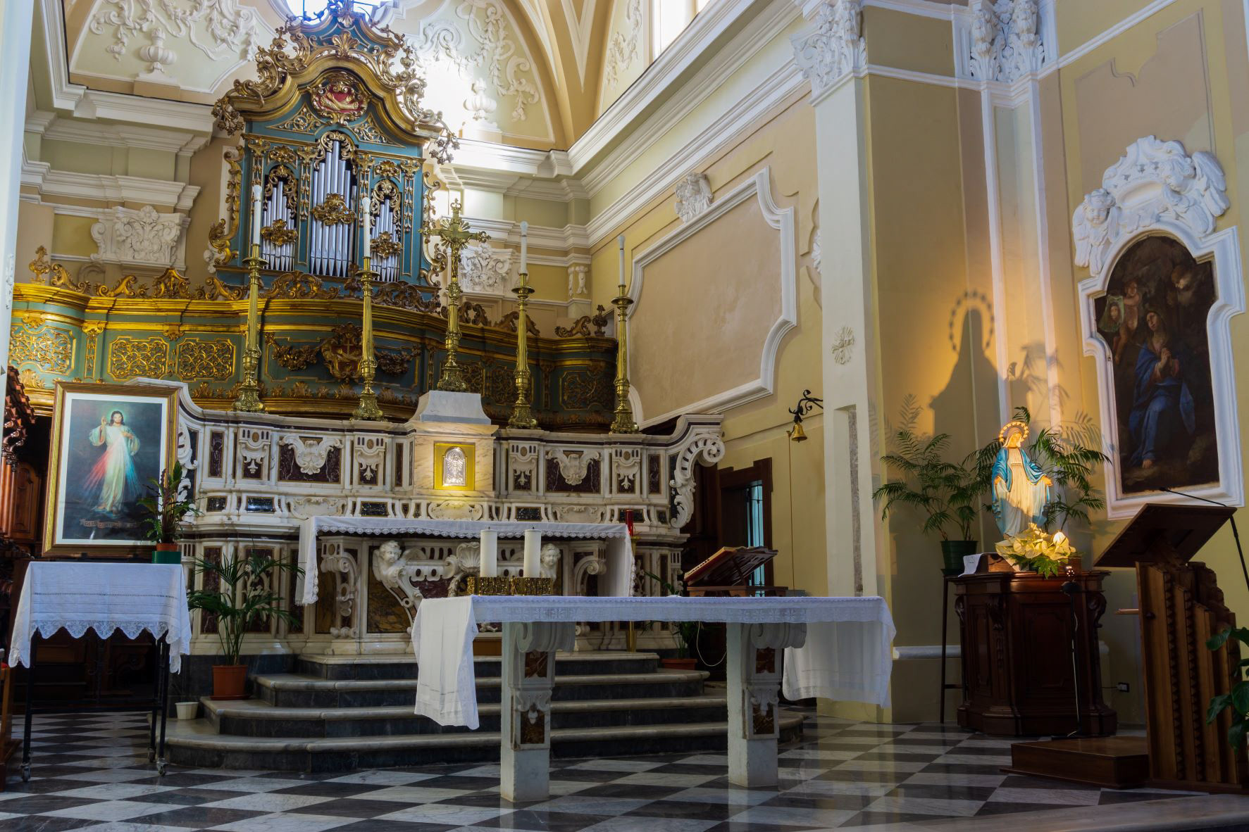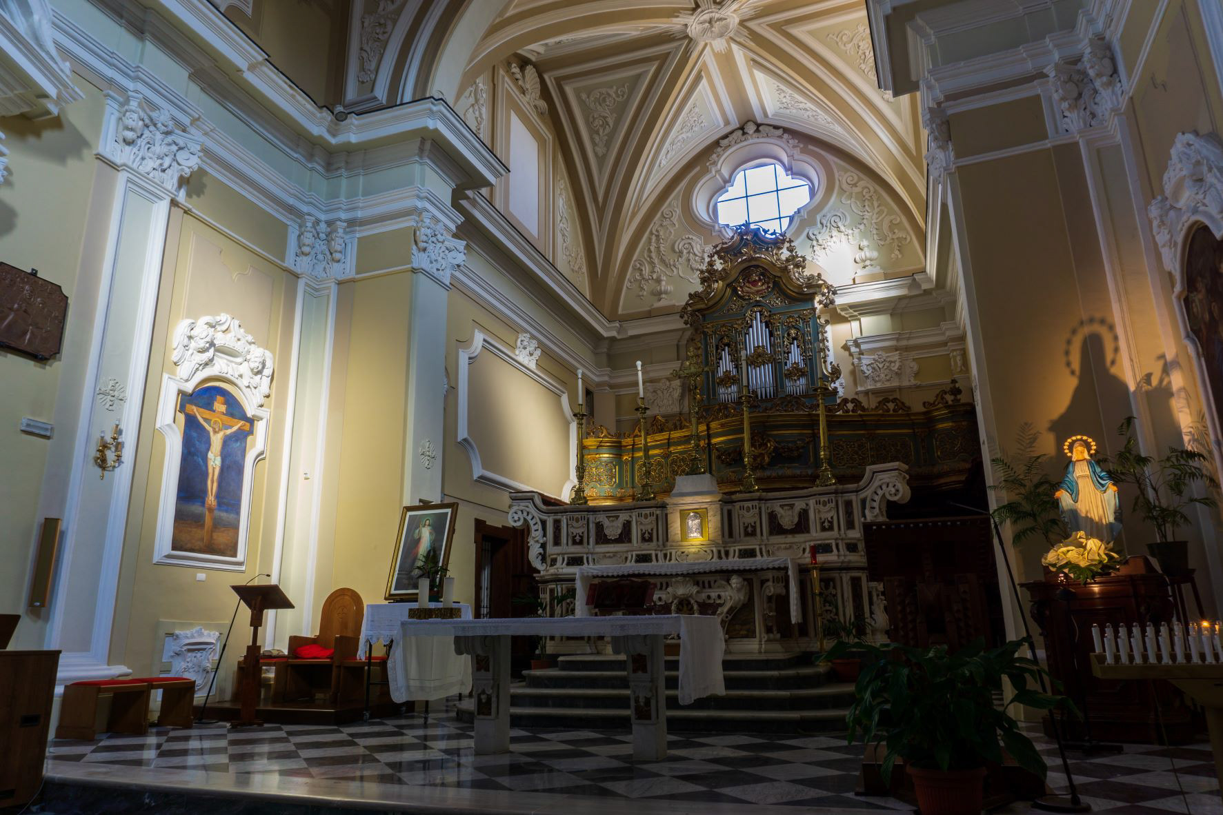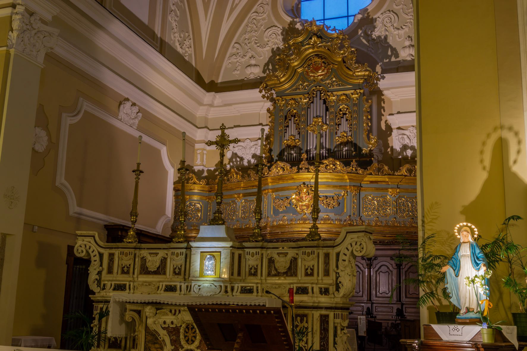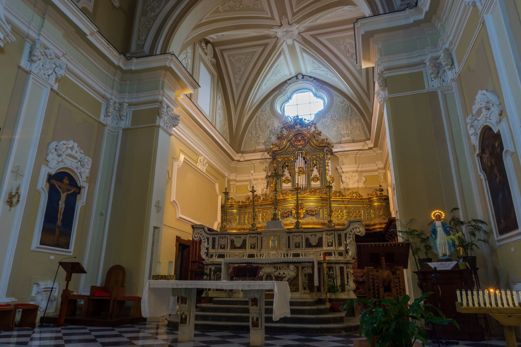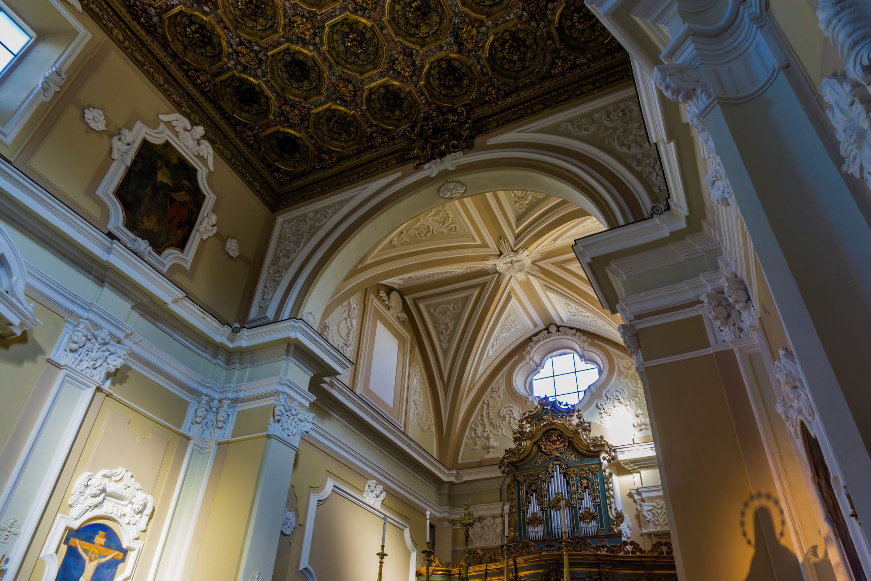 Built in the fourteenth century, in Gothic style, by the Conventual Minors it was extensively remodeled in the Baroque age. The magnificent gilded wooden ceiling with one hundred finely carved coffers, with outlines decorated with wreaths of painted roses, for the splendor of the gilded mass wins the comparison with many other similar works. The panel in the center of the ceiling (St. Francis and the council), in which the popes Pius XII, John XXIII and Paul VI and the late bishop of Teano Mons. Sperandeo are depicted, is a modern work by Augusto De Rose. On the entrance door there is a large canvas of the Immaculate Conception by Girolamo Cenatiempo (first half of the 18th century).
