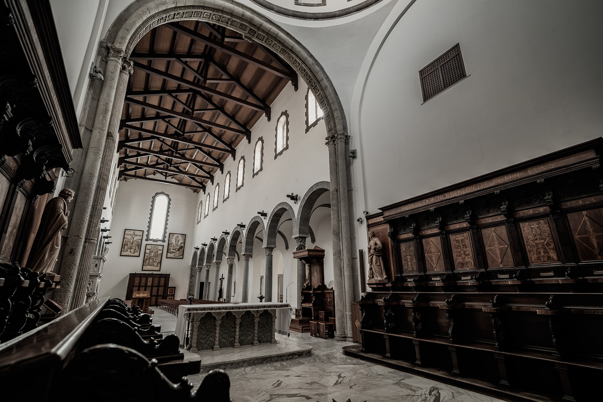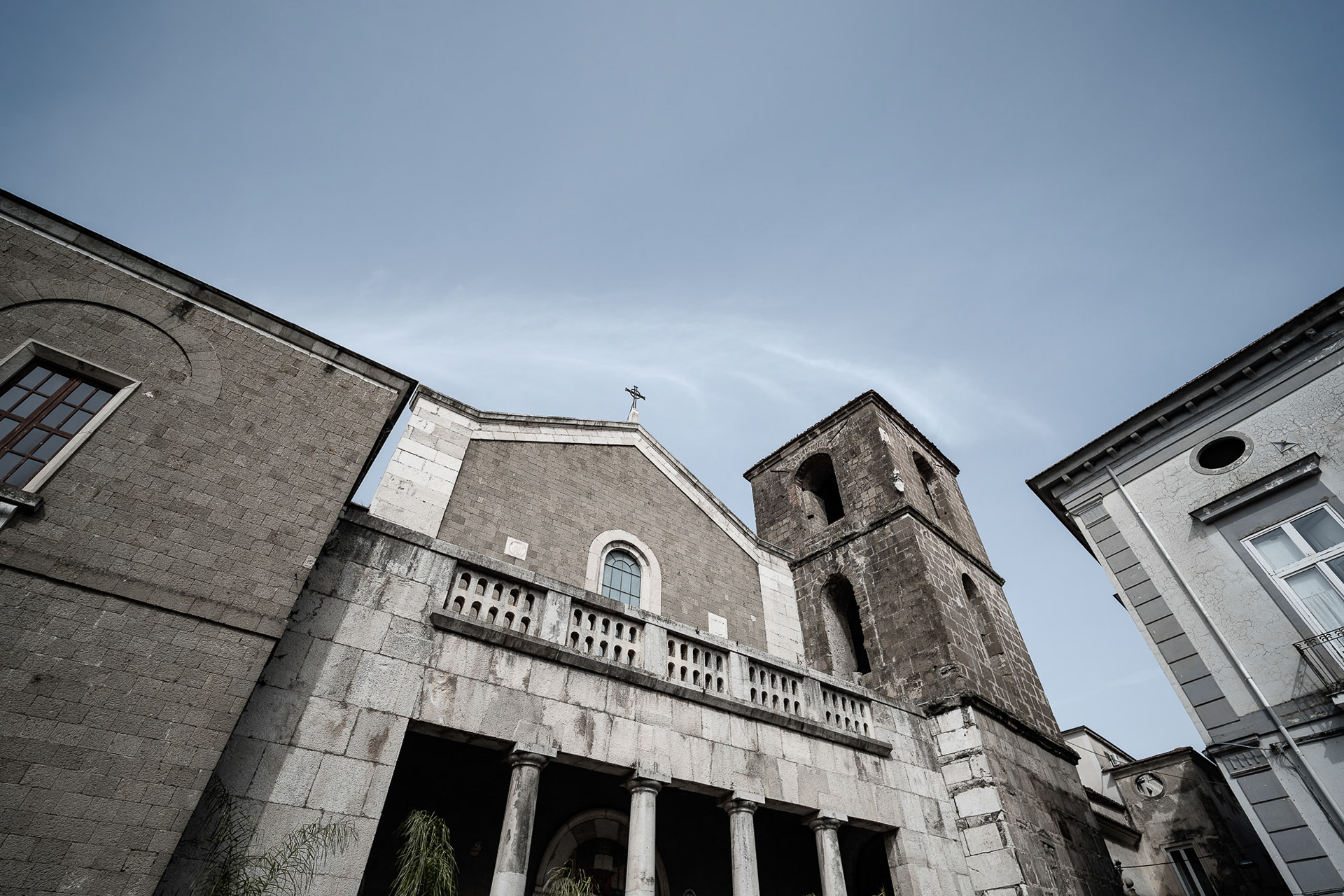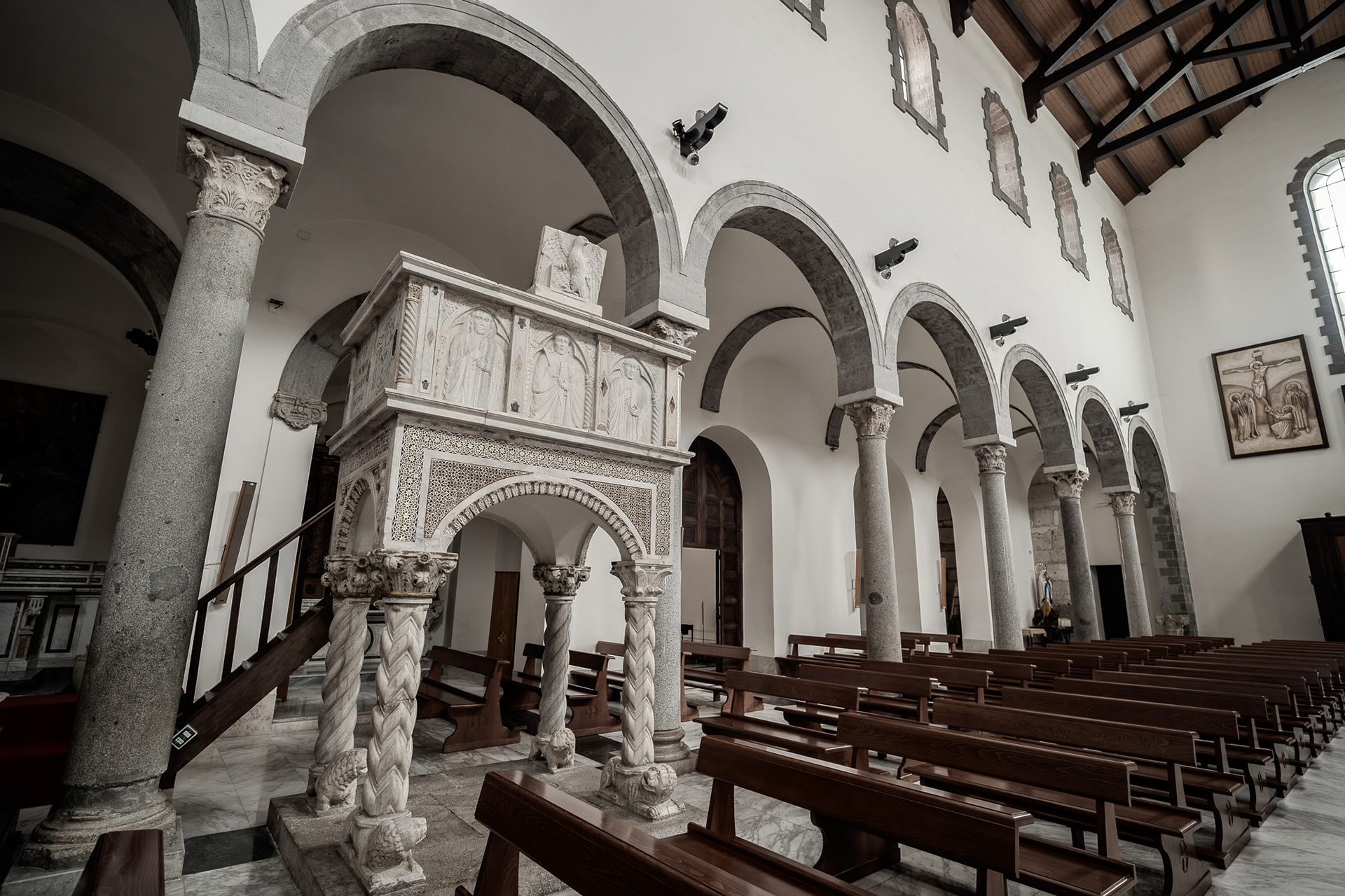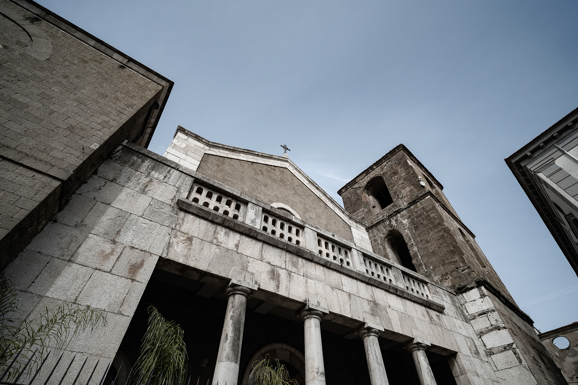 The cathedral, originally dedicated to San Terenziano, was later named after San Clemente. Construction began in 1050 by Bishop Guglielmo, to replace the old cathedral of San Paride ad Fontem, located outside the city walls. The works were completed in 1116 by Bishop Pandulfo. The building has a basilica structure divided into three naves by two rows of columns. In 1608 it was damaged internally by a fire that almost completely destroyed the cosmates ambo, subsequently recomposed using the remains of the previous one integrated with the marble slabs of a fourteenth-century sepulchral monument already present in the church and positioned on twisted columns, two of which rested on fountain lions. During the 16th century the Romanesque apse was modified and on that occasion a precious carved wooden choir was built in the presbytery, built in 1539 by the Benedictine Antonio Maria Sertorio. The choir underwent two restorations, the first in the 17th century and the second in 1957, following the damage suffered during the Second World War.