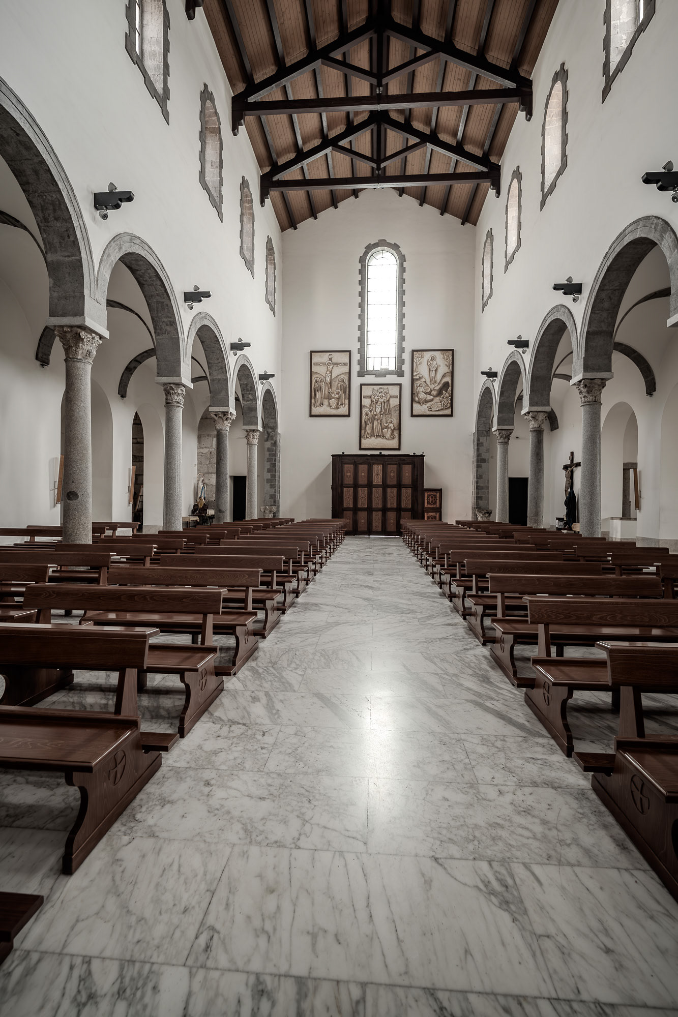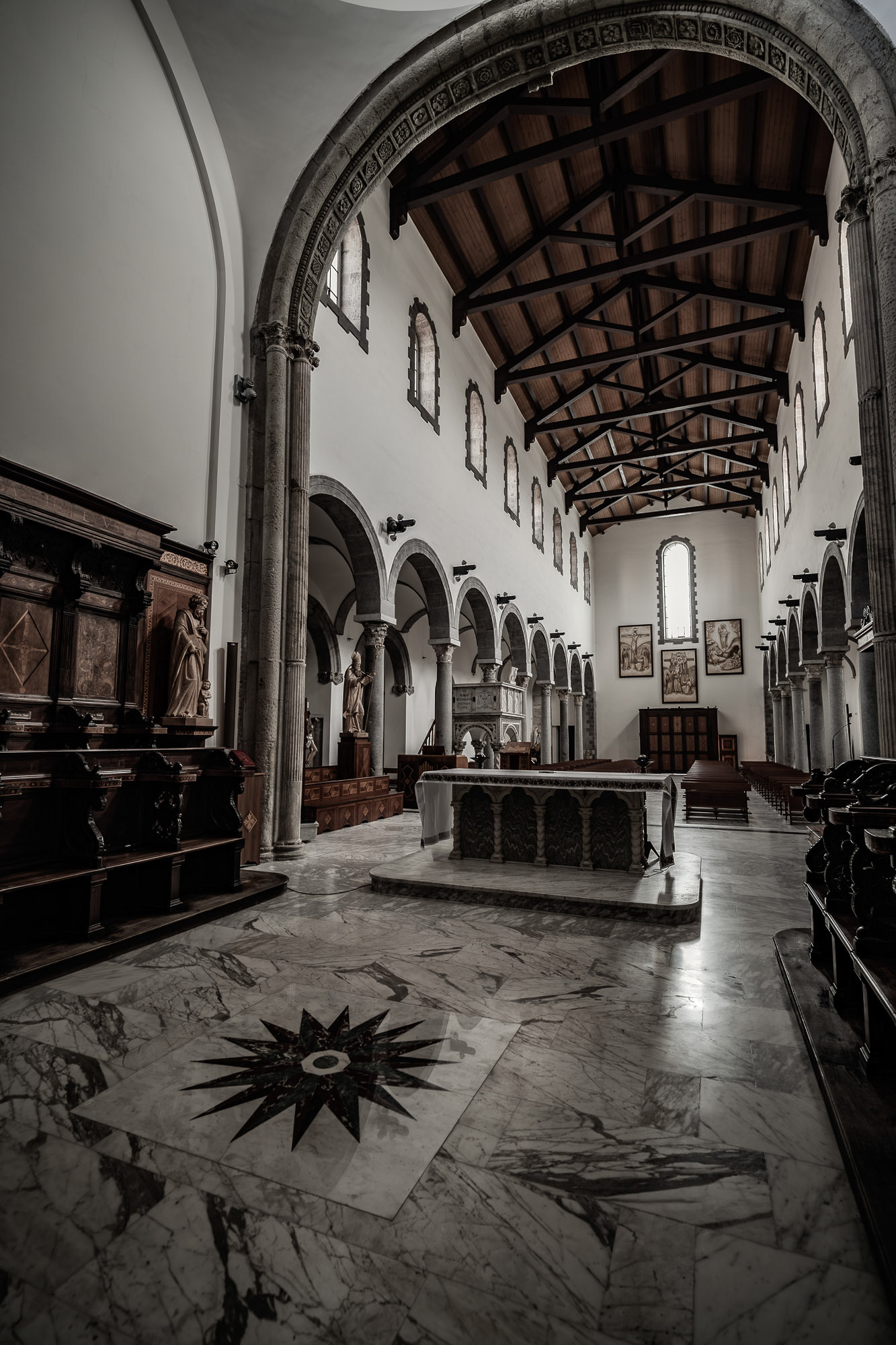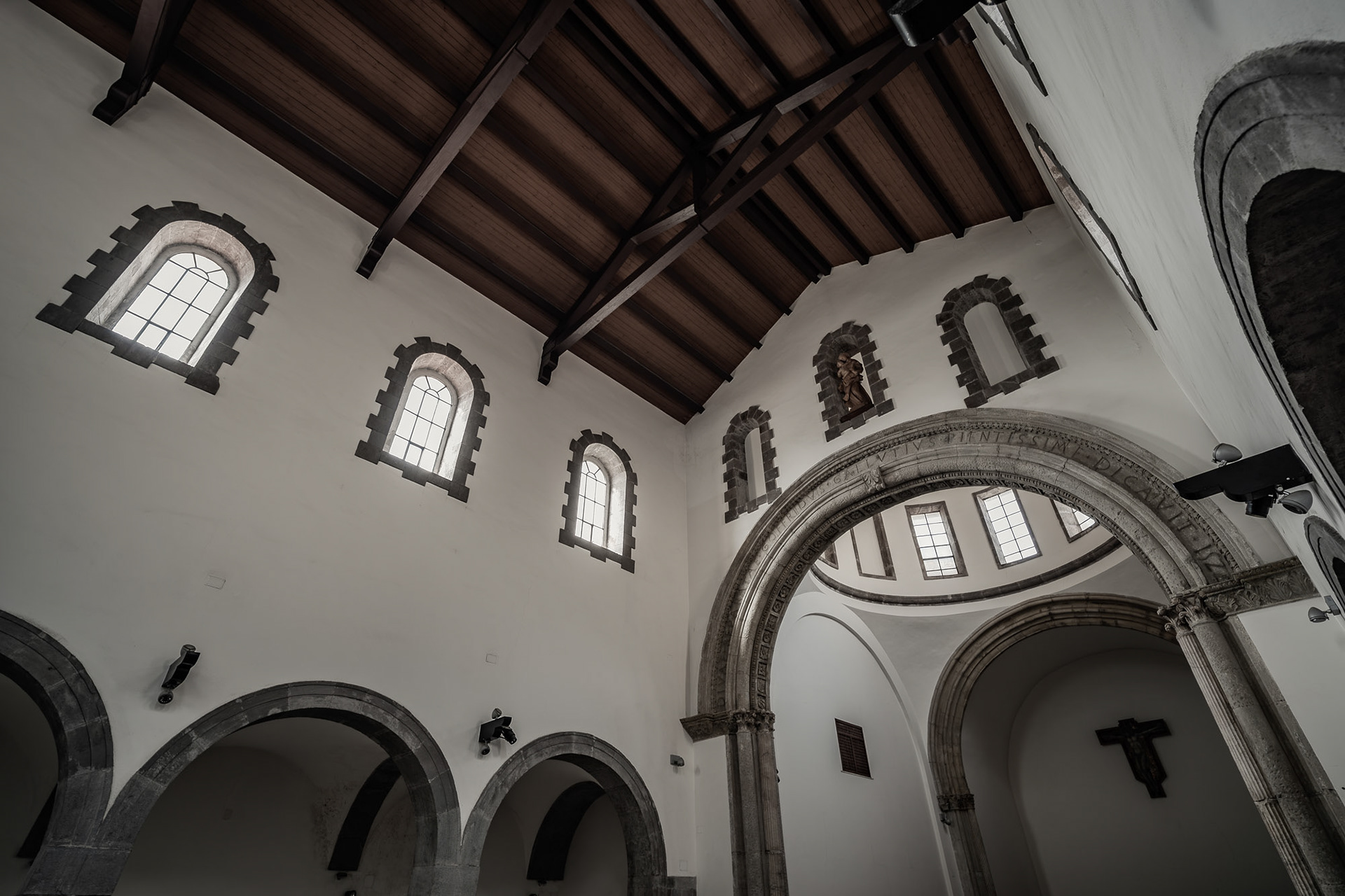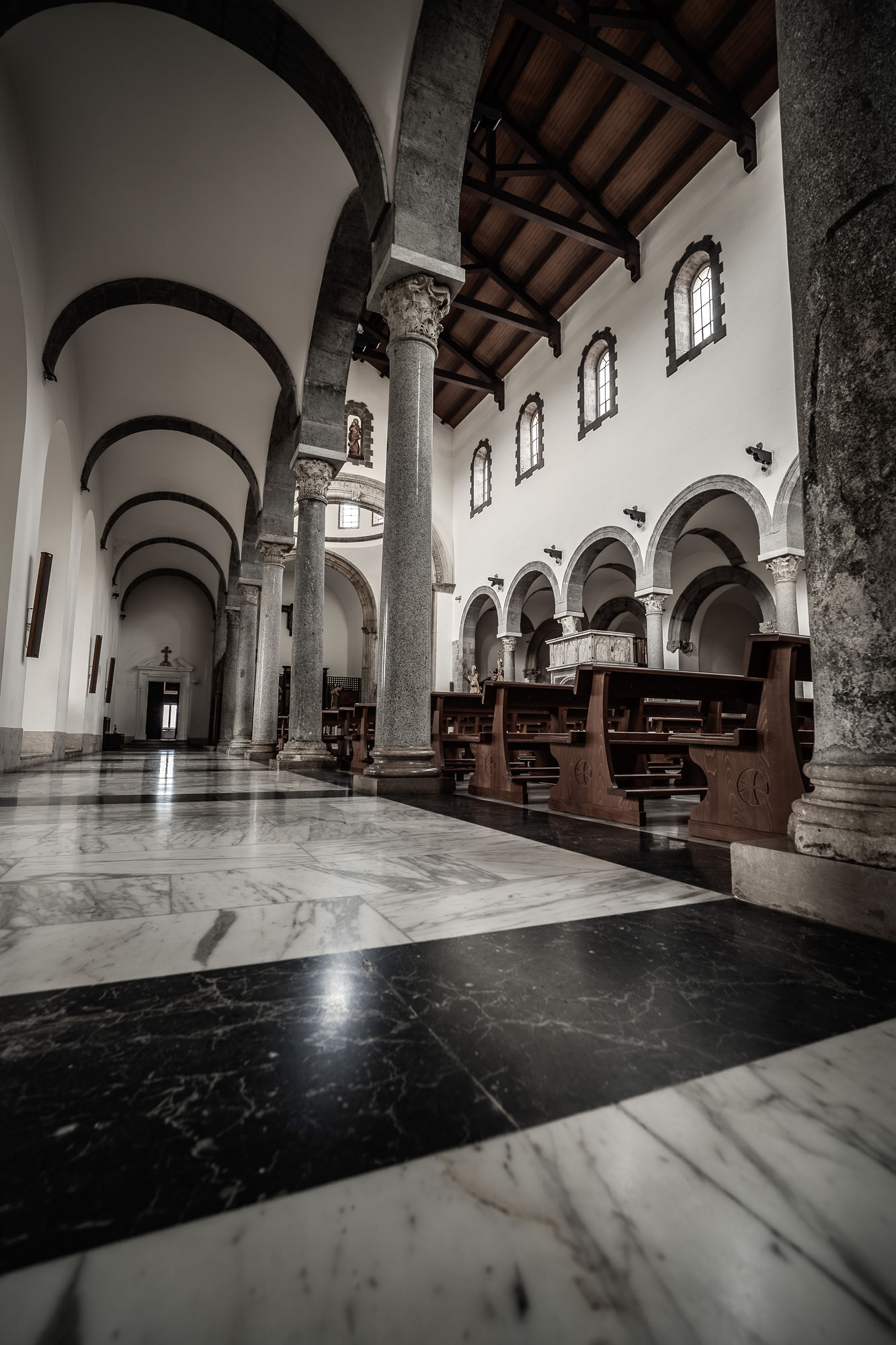 The cathedral, originally dedicated to San Terenziano, was later named after San Clemente. Construction began in 1050 by Bishop Guglielmo, to replace the old cathedral of San Paride ad Fontem, located outside the city walls. The works were completed in 1116 by Bishop Pandulfo. The building has a basilica structure divided into three naves by two rows of columns. In 1608 it was damaged internally by a fire that almost completely destroyed the cosmates ambo, subsequently recomposed using the remains of the previous one integrated with the marble slabs of a fourteenth-century sepulchral monument already present in the church and positioned on twisted columns, two of which rested on fountain lions. During the 16th century the Romanesque apse was modified and on that occasion a precious carved wooden choir was built in the presbytery, built in 1539 by the Benedictine Antonio Maria Sertorio. The choir underwent two restorations, the first in the 17th century and the second in 1957, following the damage suffered during the Second World War.